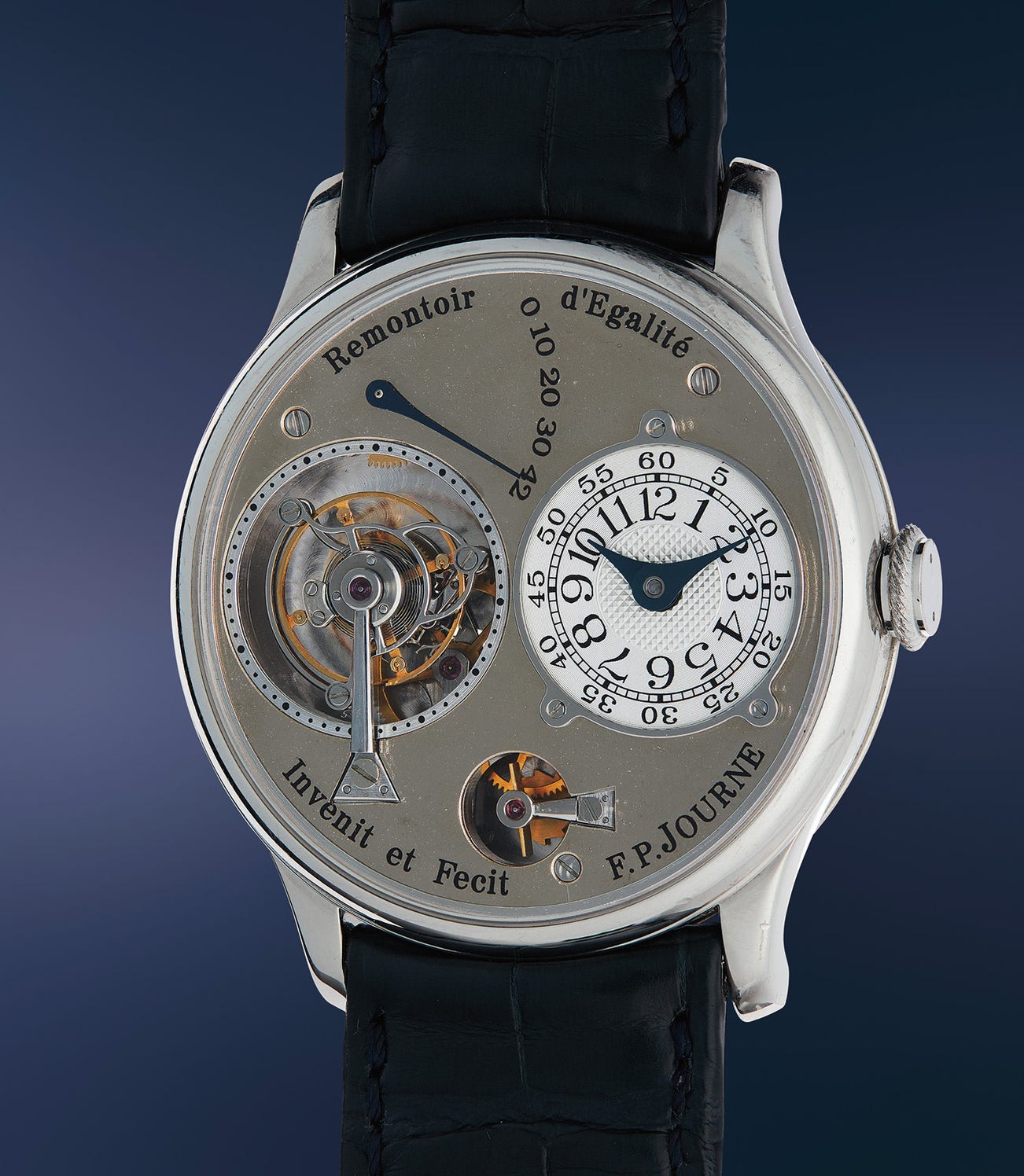 An exceptional specimen even disregarding its mechanical ingenuity, this extremely early and rare example of Journe’s Tourbillon with remontoir d’egalité is numbered 035, dating from 1999, and is classified as a second-generation version of the Tourbillon due to its similarity to the Souscription series dials. The only difference is the addition of the “remontoir d’egalité” text on the dial for the second generation. Some scholarship suggests that the 16 or 17 watches after the 20 souscription watches were produced in parallel with the Souscription series. Another important note: Number 35 is the first known watch to bear the current numbering configuration of XX/YYT. The case back engraving style is Journe's earliest-extremely shallow and also extreme sought after.