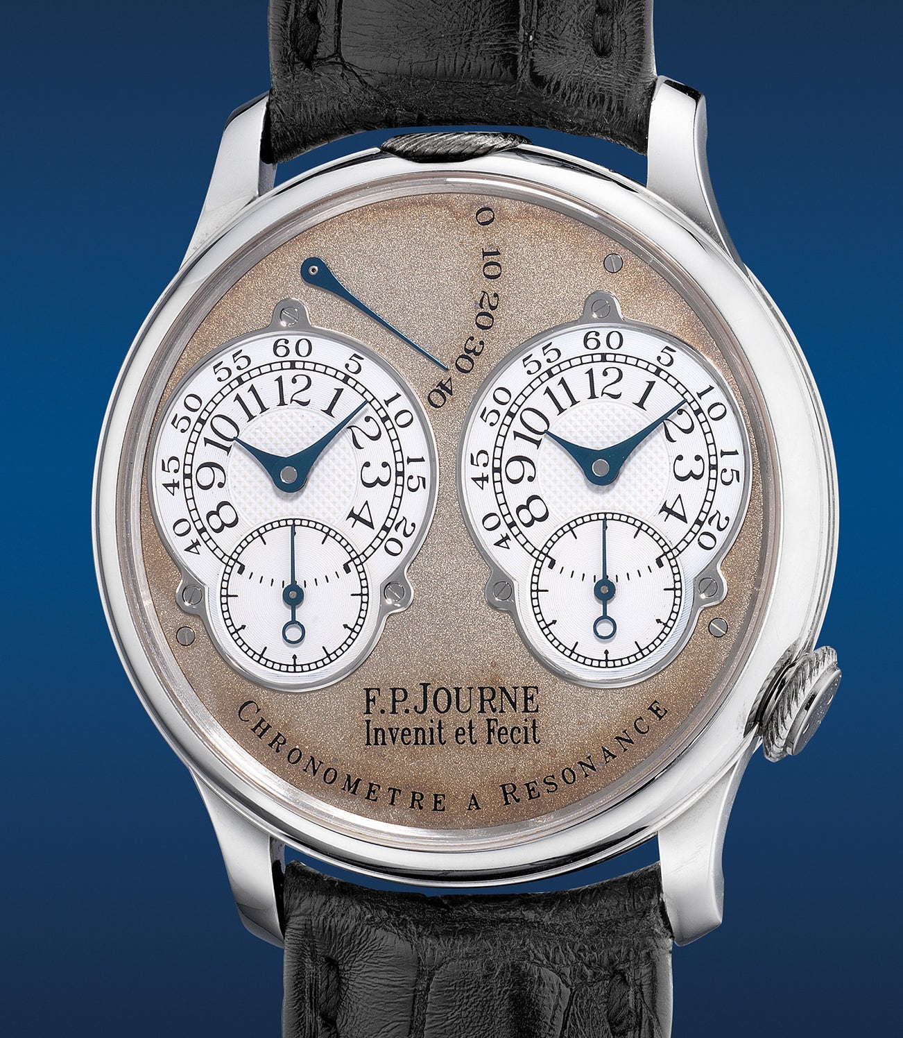 Made from 2000 to 2005, the first generation Chronomètre à Resonance, like the present lot, features rhodium plated brass movements and a 38mm case. The second generation was housed in a 40mm case with a gold movement.