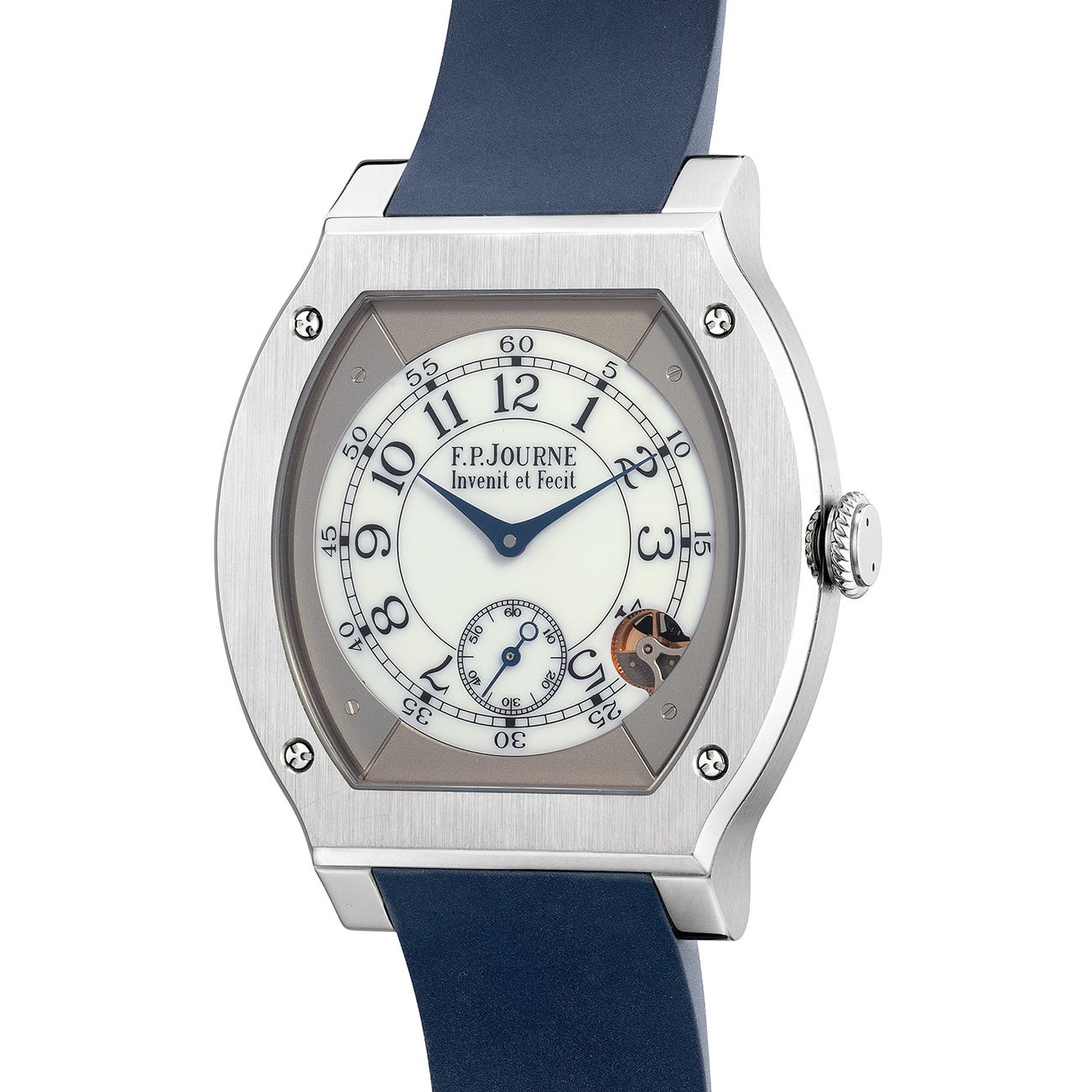 The present Élégante cased in titanium is paired with a midnight blue rubber strap that perfectly embraces the wrist with sophistication. Offered in an excellent overall condition and accompanied with its original accessories, the Élégante is certainly one of the most sought after independent timepiece born for the discerned collector with a passion for horology.