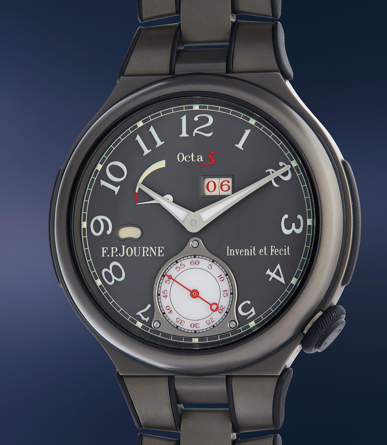 In 2011 Journe released his “lineSport” collection including the Octa Sport and Centigraphe made in ultra-light aluminum, which was inspired by a passionate Journe collector, who as a sportsman was looking for a model he could wear during marathons and triathlons. In 2014, F. P. Journe unveiled new titanium cased models of the pair, which remained the same mechanically, but titanium proved to be a more durable metal. The new automatic Octa Sport is a sleek and contemporary wristwatch with the grey aluminum dial complimenting the grey tone of the case and bracelet. The dial is highlighted with red accents from the date numerals within the oversized apertures set slightly off-center at 12 o’clock, to the red and white day/night indication, subsidiary seconds, and the “S” in “OctaS”.