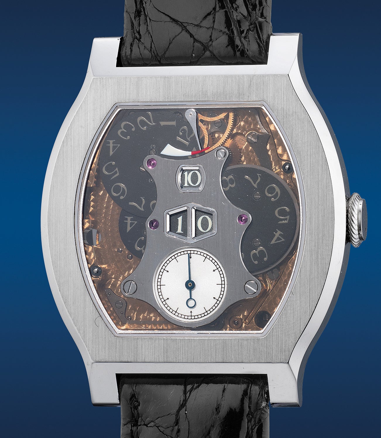 A very fine and rare limited edition semi-skeletonized platinum tortue-shaped wristwatch with small seconds, jump hour and minutes, power reserve indication, certificate and presentation box, numbered 58 of a limited edition of 69 pieces