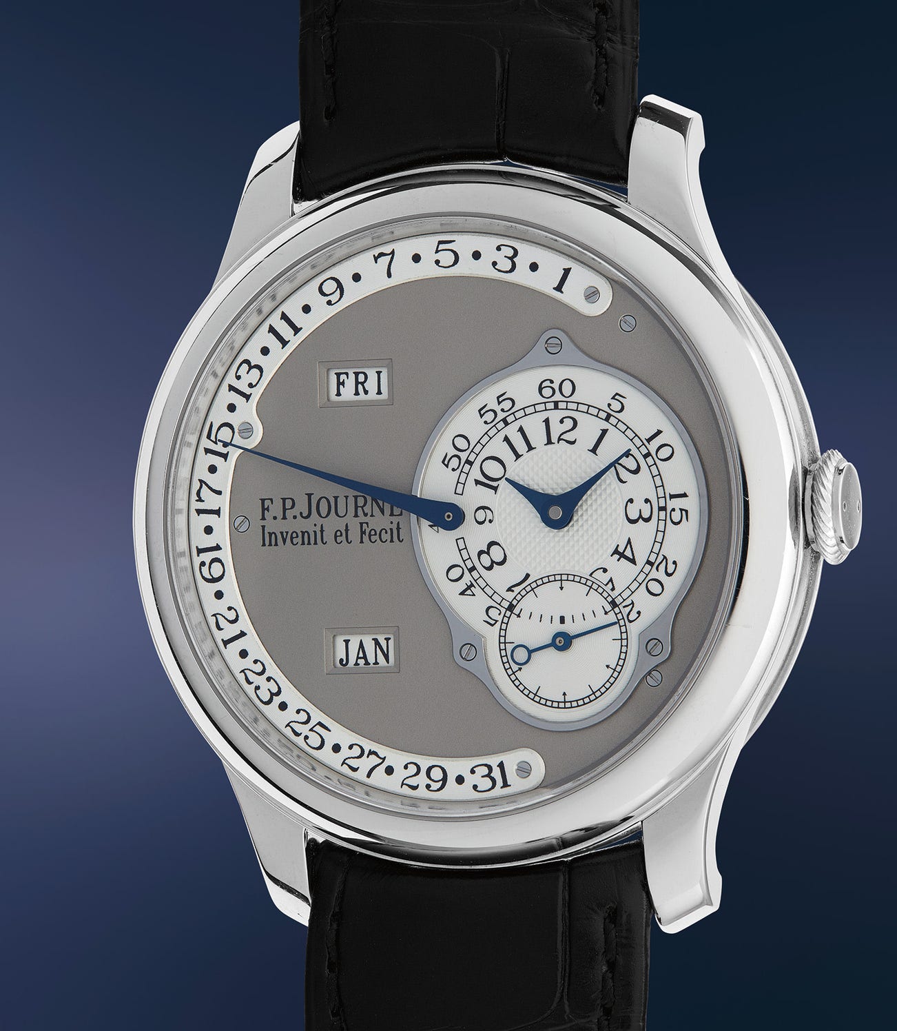 The present F.P. Journe Octa Calendrier in platinum from approximately 2008 with an attractive grey dial is offered here for the first time at auction. With a substantial surge in demand for F.P. Journe timepieces today, this is a great opportunity for collectors to acquire a discontinued example of one of the most iconic models manufactured by the firm.