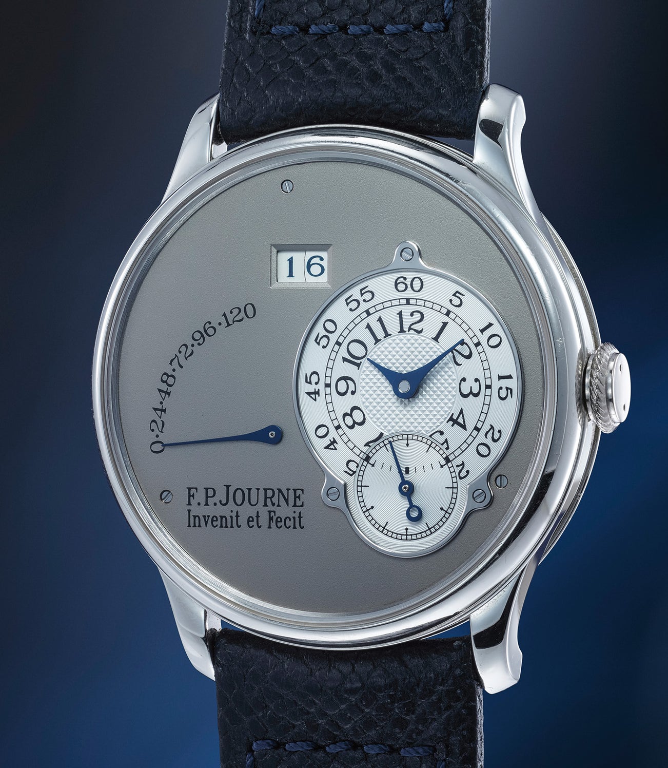 Taking a closer look at its aesthetic composition, the dial is asymmetric, with the time displayed within a framed sub-dial on the right. However, the eye is drawn to the left side of the dial with the power reserve indicator and oversized date aperture. Highly legible and balanced, this new and refreshing design is pure F. P. Journe’s artistry.