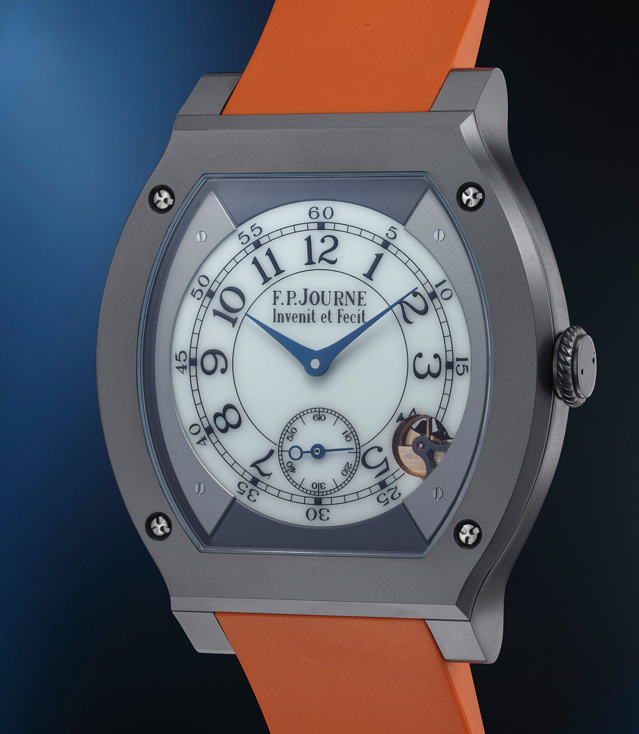 The present Élégante, with its 48mm Titalyt case, is paired with an orange rubber strap giving the watch a very sporty yet elegant and sophisticated look. Offered in excellent overall condition and accompanied with its accessories, the Élégante is certainly one of the most sought after independent timepiece with its superb technical innovation and classical tortue case.
