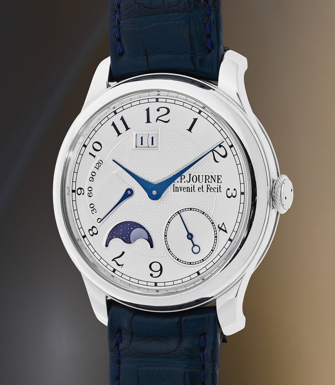 In 2007, Journe released the “Automatique Lune,” featuring a new dial layout with the hour and minute position moved to the traditional horological display format at the outer rim of the dial. The new model offered a classic, clean, easy-to-read display, and while the moon-phase and large date apertures remained the same, the Arabic hour numerals were newly prominent at the periphery of the dial with the railroad minute track between them. The present Octa Automatique Lune is fresh-to-the-market and in excellent overall condition, accompanied by its original presentation box and a Journe Certificate of Authenticity dated to 2013.
