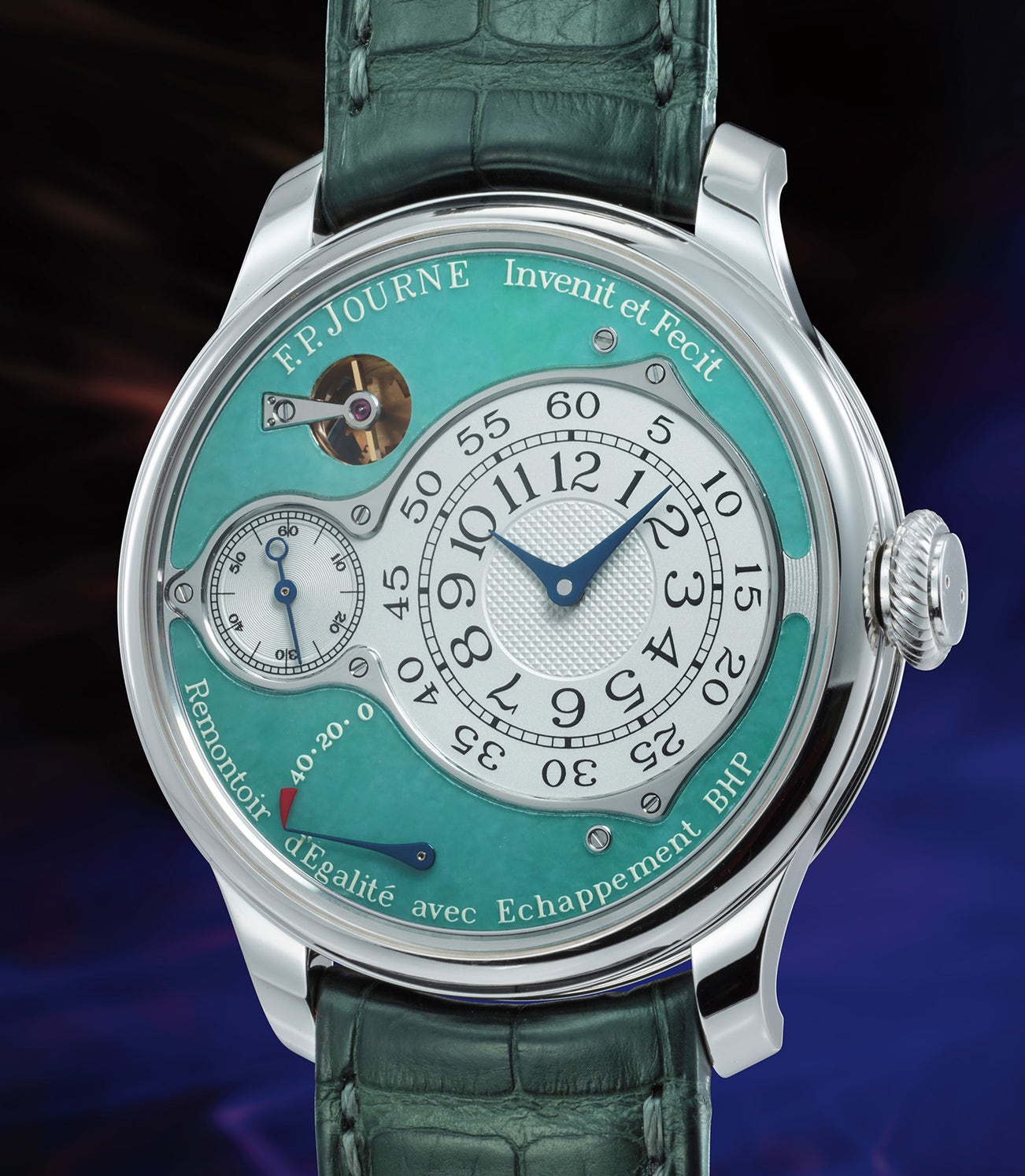Jade is rarely used in timepieces as at a certain thickness (or thin-ness), jade will crack, and it requires extreme care, skill, and artisanship to place in a watch dial. Though known for its importance in East and South Asian cultures, jade also possesses special meaning for Mesoamerican cultures and the Māori of New Zealand, where it is considered a taonga or “treasure” protected by the Treaty of Waitangi. The present piece of jade possesses a calming sea foam color, reminiscent of the warm and shallow waters of one of the Pacific islands. A close study of the dial reveals mesmerizing details, including how the printing of all text and graphics over the main jade dial appear to float above the surface. The Chronomètre Optimum was first conceived as an idea in 2001, however the first example was not released until 2012. A showcase of watchmaking proficiency, it adopts concepts from other Journe models: the double barrel layout of the Chronomètre Souverain, and the remontoir d'égalité system of his tourbillon wristwatch. The Optimum is to be considered Journe’s “ultimate” technical essay on precision, reuniting the most efficient chronometer solutions from previous models, and then adding to them a new escapement.