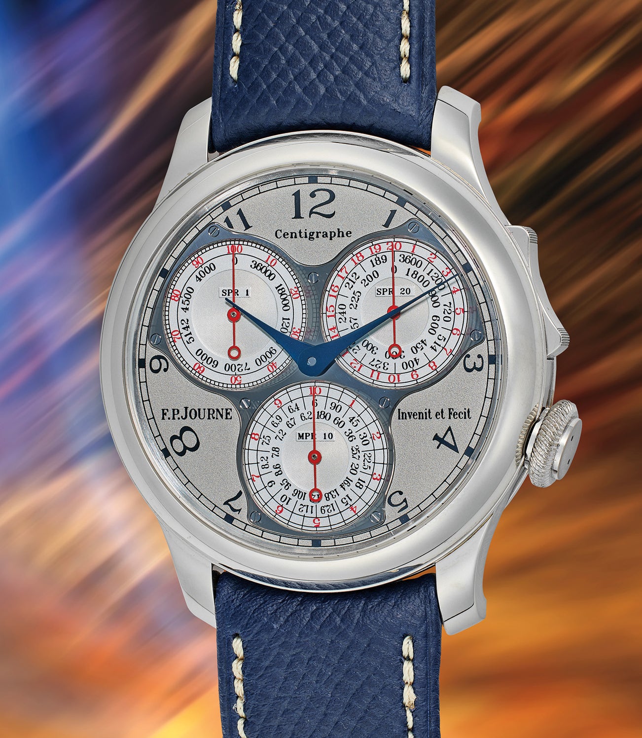 The stealthy combination of platinum case and white gold dial gets an added touch of excitement with red accents within the subsidiary registers. Consigned by the original owner, the present Centigraphe, numbered 005, is the fifth example ever made, and preserved in like new condition with all of its original accessories.