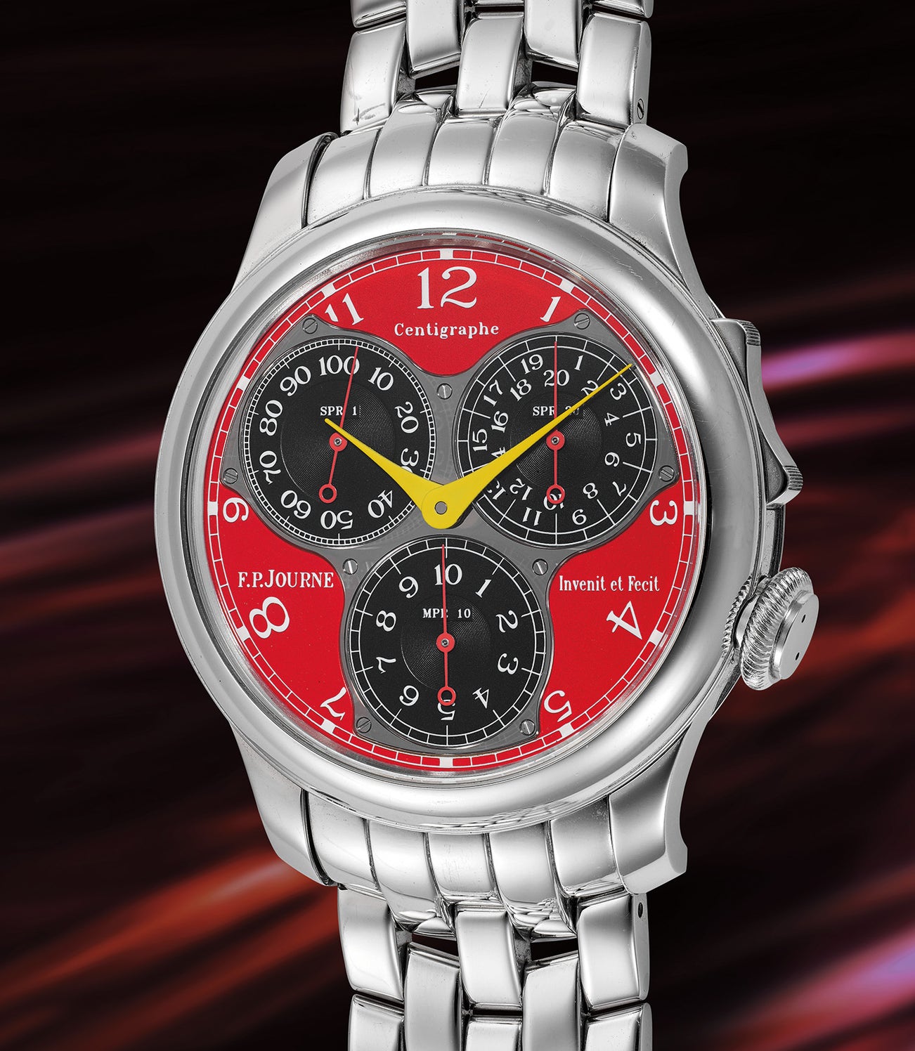 A striking, extremely rare, and innovative platinum chronograph wristwatch with vibrant red dial, bracelet, 100th of a second, 20-second, 10-minute registers, guarantee, and presentation box