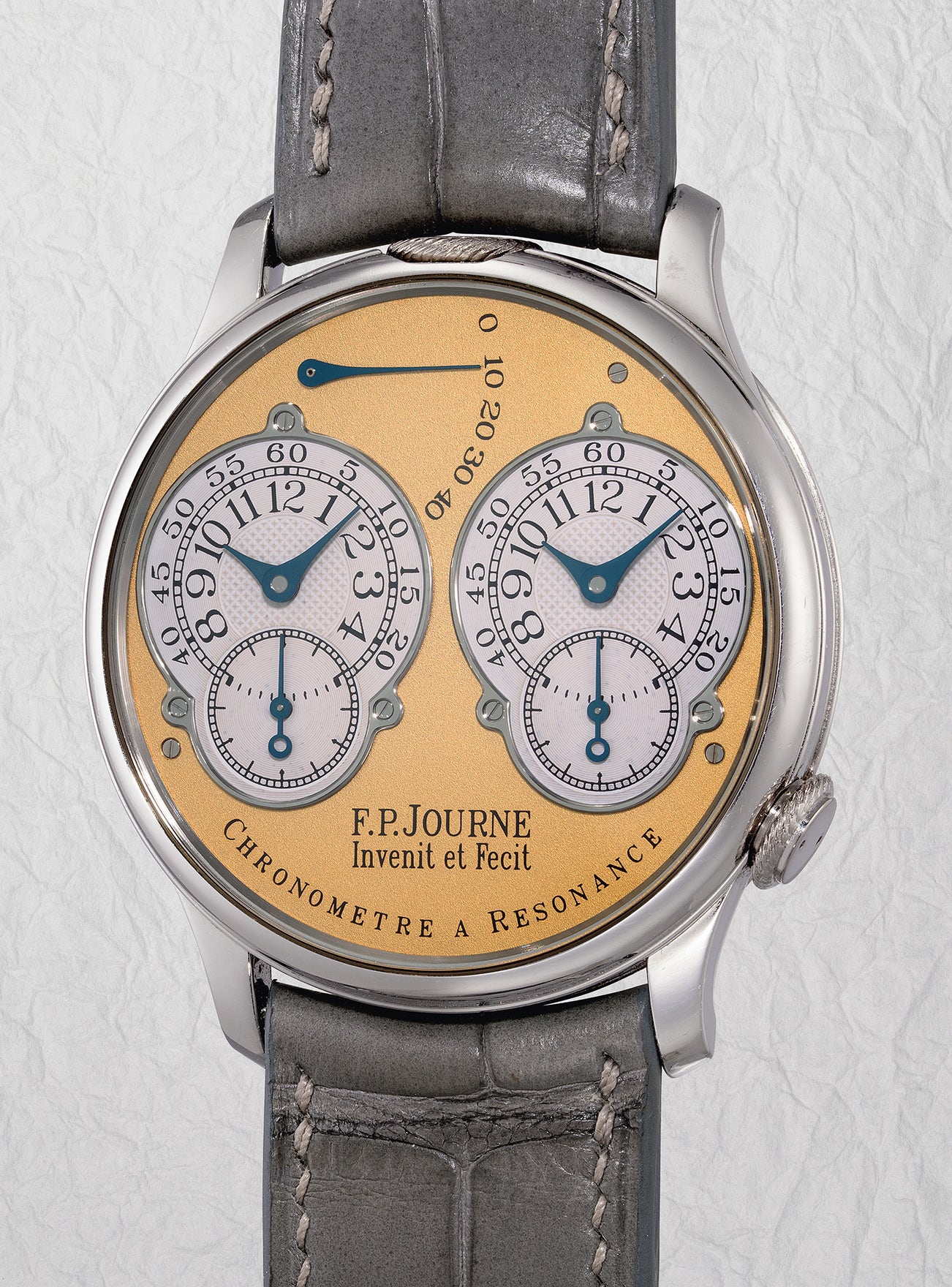 Drawing inspiration from 18th century French royal clockmaker Antide Janvier's double pendulum clocks, in 1983 Journe succeeded in miniaturizing Janvier's system by creating the first pocket watch to incorporate dual balances oscillating in resonance. This feat was considered near impossible to translate to wristwatch scale at the time, but Journe's visionary talent and determination led him to accomplish this 17 years later, unveiling the Chronomètre à Resonance in 2000.