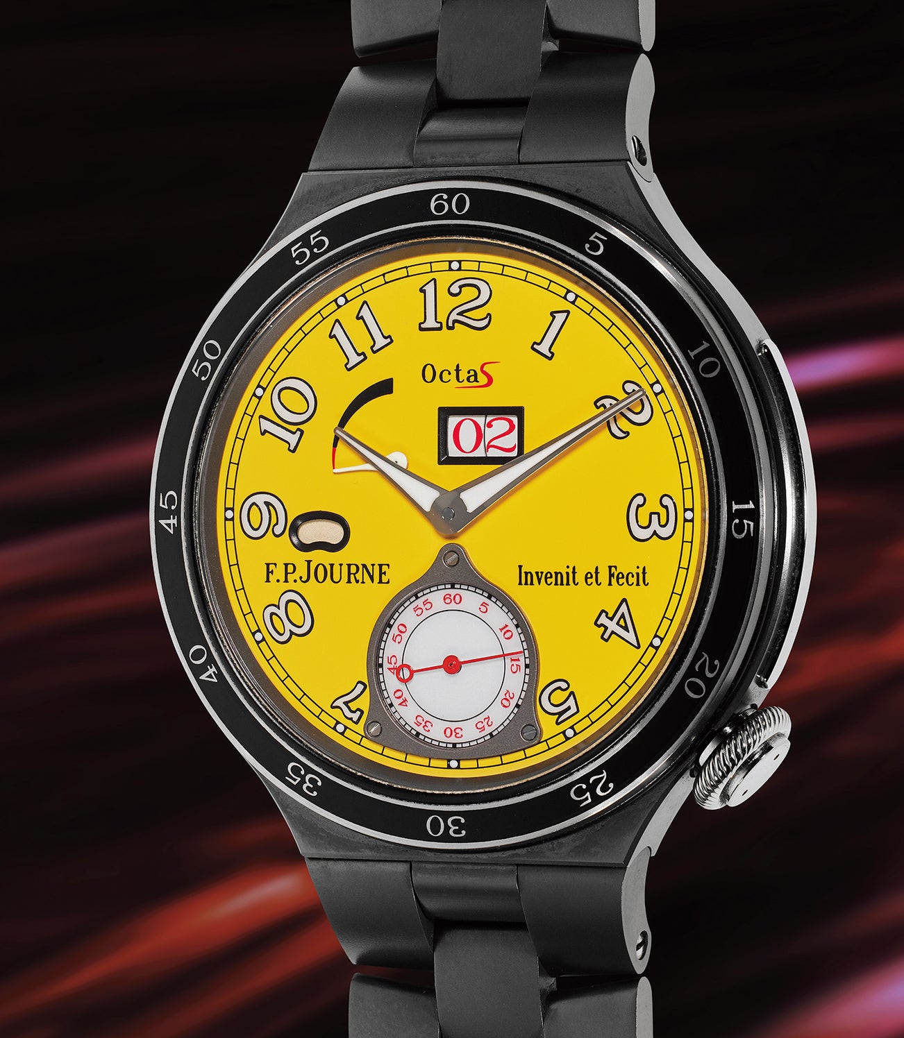 In 2011, Journe released his Octa Sport line made in ultra-light aluminum, which was inspired by an important collector of the brand - a sportsman who sought a timepiece he could wear while completing a marathon or triathlon. Journe once again excited the watch world with his introduction of the next generation Octa Sport Automatique Réserve 2 in 2018 with three models: platinum with blue-mauve dial, 18K 6N gold with Ruthenium dial, and Grade 5 titanium with either anthracite or yellow dial, like the present example.