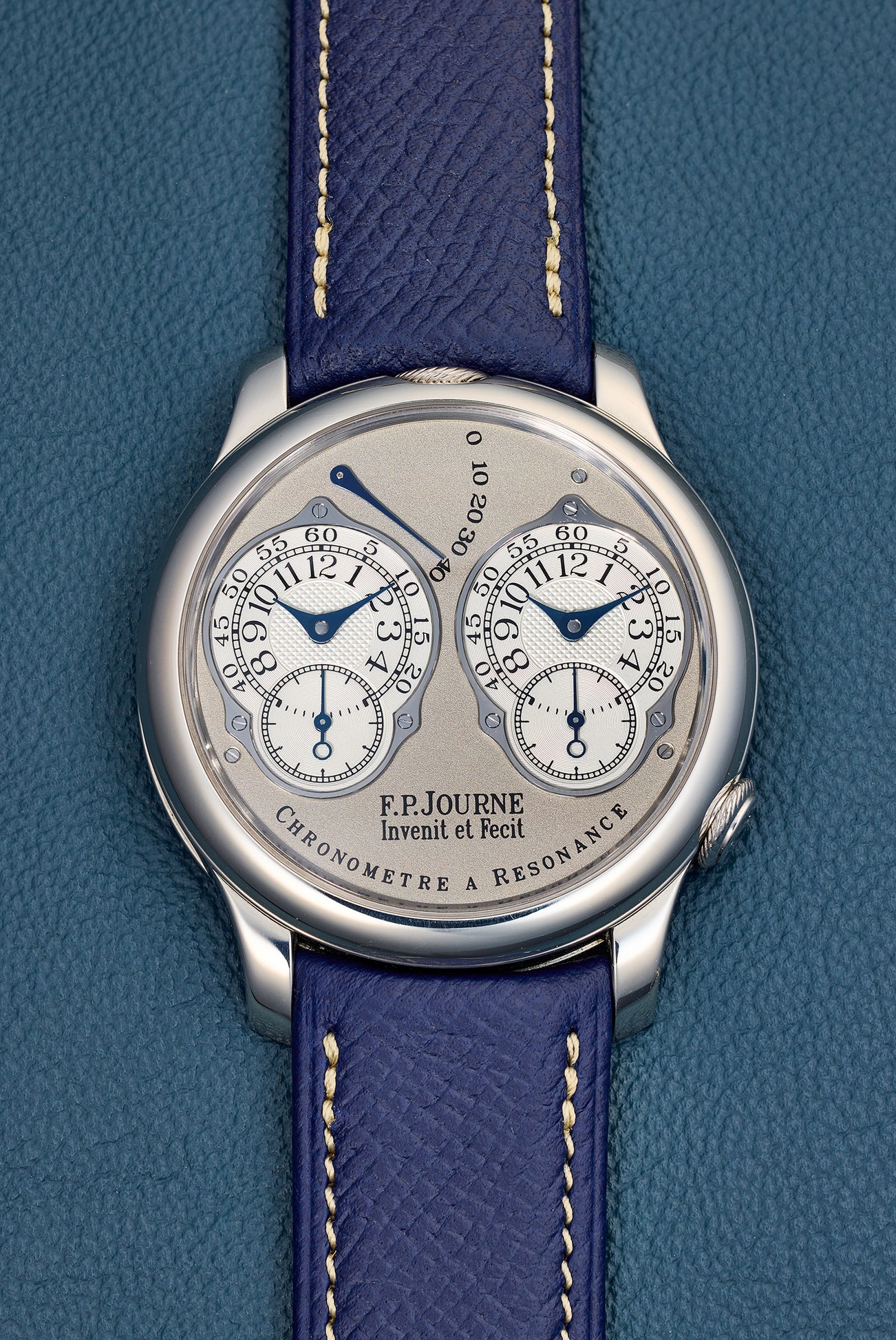 • Inspired by the work of the great 18th century watchmaker Antide Janvier, and certainly Abraham-Louis Breguet, François-Paul Journe took up the challenge beginning in 1983 to first create a pocket-watch using the resonance phenomenon and followed it with a wristwatch 16 years later: the world’s first wristwatch to feature the resonance phenomenon. The movement is composed of two independent balances, alternatively serving as an “exciter” and “resonator”. When in motion, the balances create the resonance effect and beat in synchrony, naturally evening out each other’s discrepancies and thus permitting greater accuracy. Two individual 12-hour dials, each with its own small seconds, center the dial architecture.
