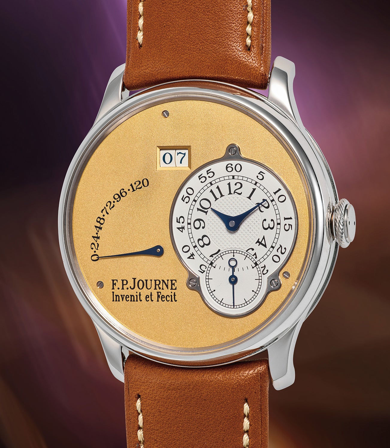 The Octa Réserve de Marche features Journe’s signature elements that collectors have come to love, including a 38mm platinum case, a highly legible gold dial with offset time indication on the right, a power reserve indicator, and large date display. Fitted with an early brass movement and a beautifully preserved yellow gold dial, the design aesthetic is pure F.P. Journe.