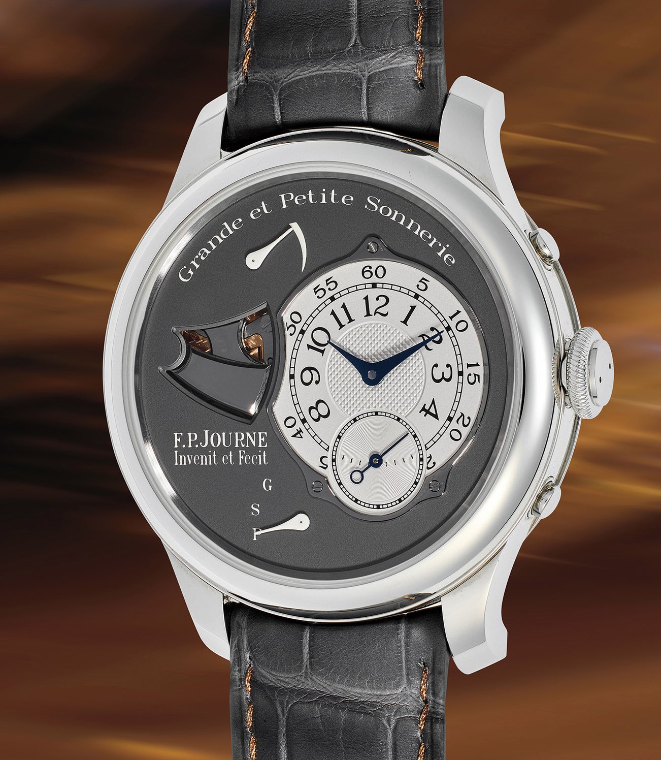 Never before seen by the public, the present Grande and Petite Sonnerie wristwatch from F.P. Journe is a possibly unique creation fitted with a stunning ruthenium dial. Previous examples sold by Phillips have featured black dials, and while other dials are known, this is the first ruthenium dial to have surfaced.