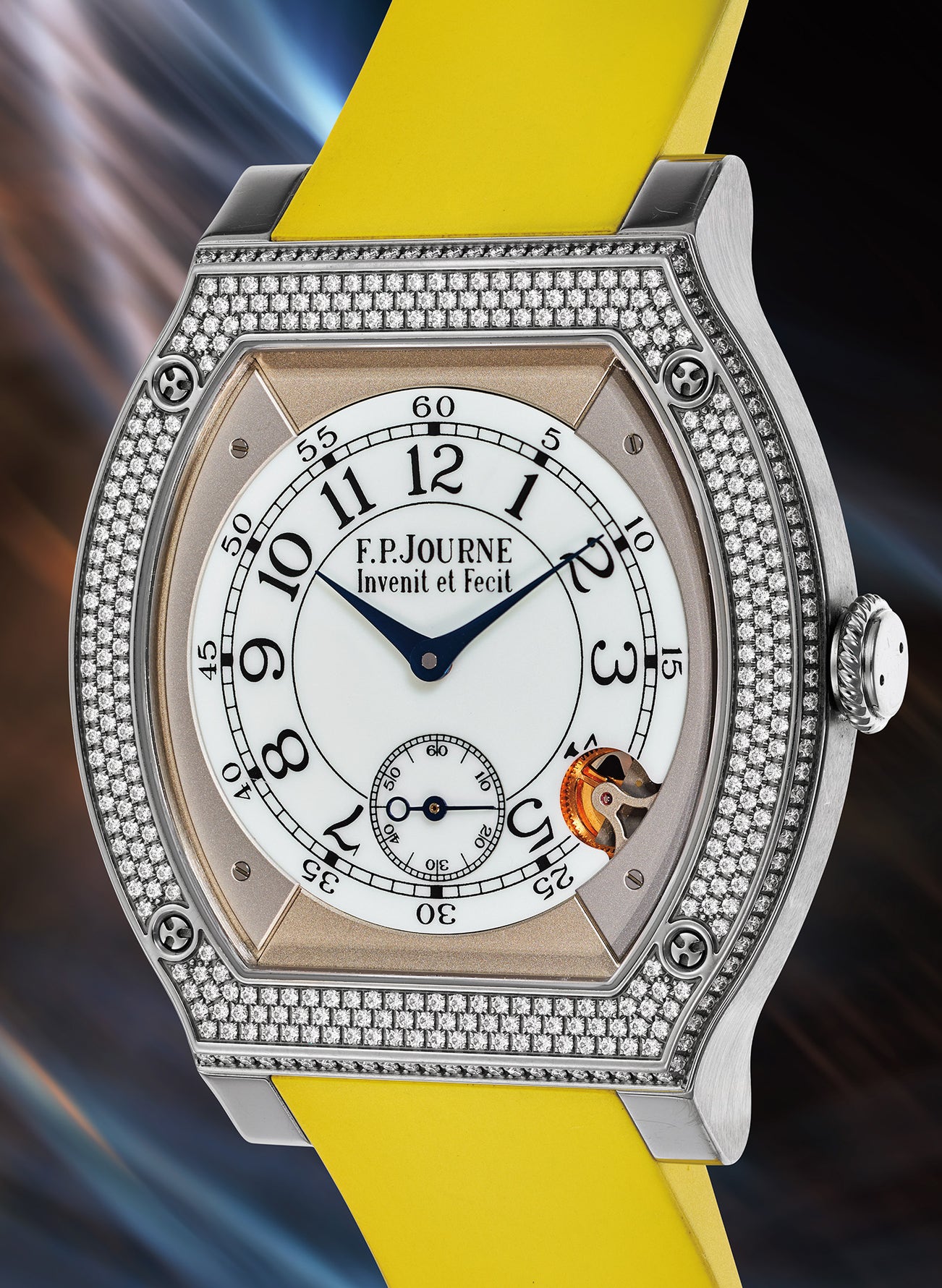 The present example with pavé diamond-set bezel from 2018 is offered for the first time at auction and is complete with its suite of accessories. The Élégante is one of F. P. Journe’s most endearing and unique timepieces and this stunning, gem-set version is perfectly suited for every day or even formal wear.