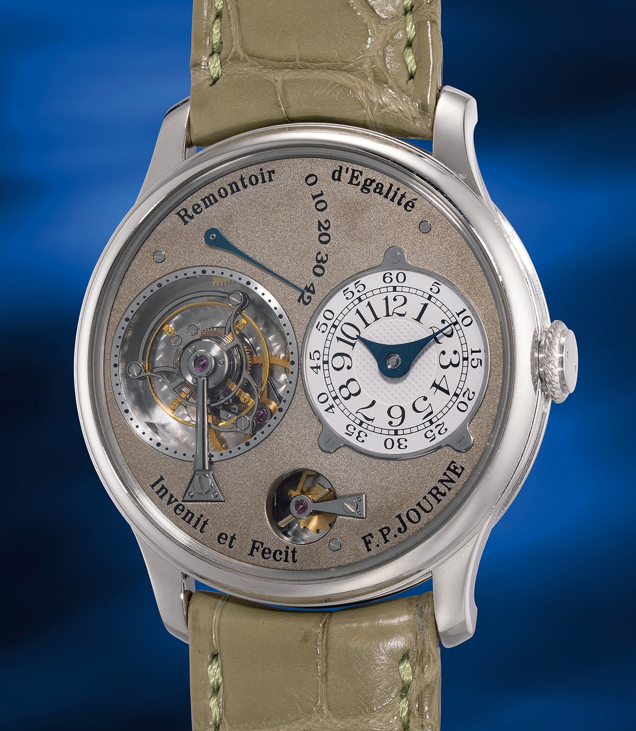 An extremely rare, well-preserved and important platinum tourbillon wristwatch with remontoir d’egalité, white gold dial, brass movement, warranty and presentation box