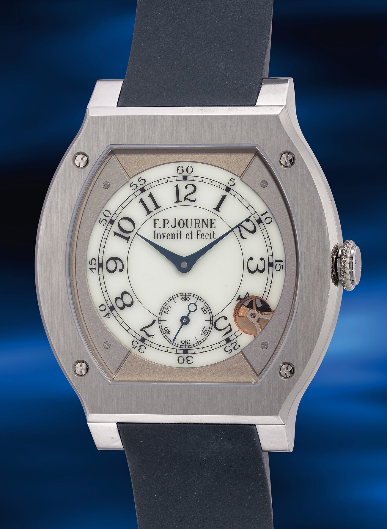 A “like-new”, sought-after and impressive electro-mechanical titanium tortue-shaped wristwatch with small seconds, guarantee and presentation box
