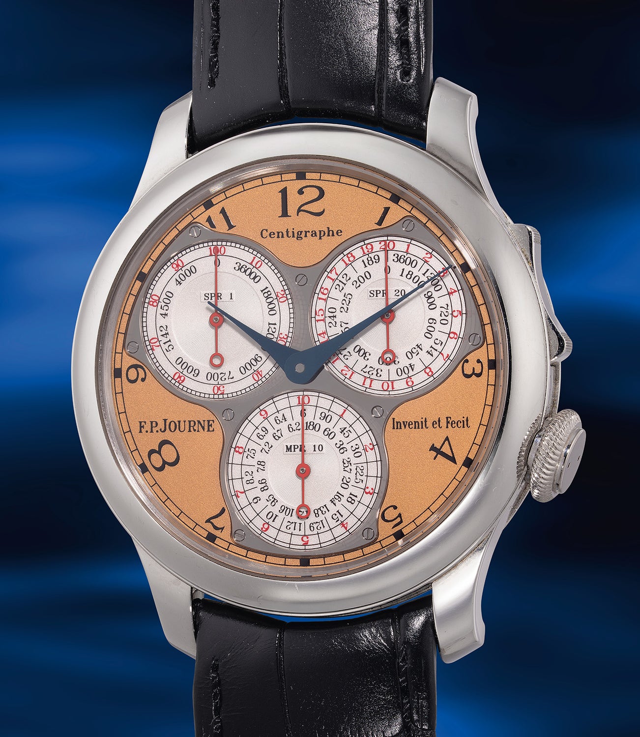 The dial of the Centigraphe is a marvel of unconventional chronograph design, featuring three distinct registers: a 1/100th of a second counter, a 20-second counter, and a 10-minute counter. A single pusher activates and deactivates the chronograph, allowing all three registers to operate simultaneously. The 1/100th of a second register is particularly mesmerizing, with its hand spinning at incredible speed—a feat made possible by a unique mechanism that isolates the chronograph from the timekeeping system, ensuring the watch’s amplitude remains unaffected during operation.