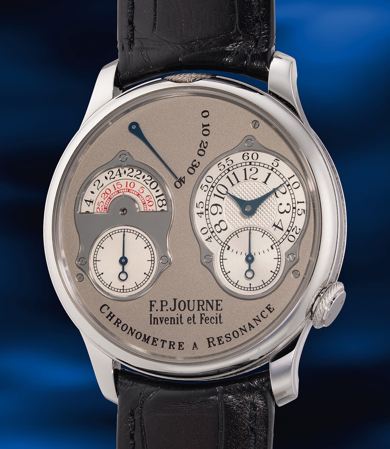 The present example belongs to the “RT” series, which began production in 2010. Numbered 33, it is an early and particularly rare example in the original 38mm case size, as the majority of later models were produced in 40mm. What truly distinguishes this piece is its unique dial configuration: rather than the more commonly seen mirrored displays, it features the highly coveted “parking meter” 24-hour rotating disc on the left subdial. Encased in platinum, this dial layout is exclusive to this specific Resonance model, making it a standout within the series.