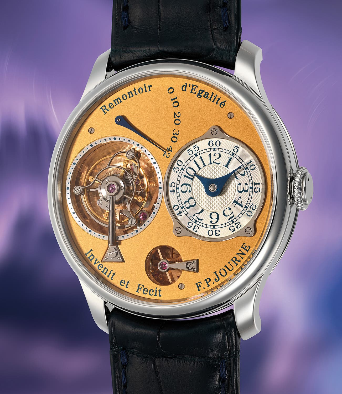 The gold dial is a study in harmony and restraint. Its warm bronze hue provides a grounded backdrop against which each indication is rendered with exceptional clarity. The one-second remontoir d’égalité sits in perfect vertical alignment with the hours and minutes, symbolically positioning the constant-force mechanism at the very core of timekeeping. The navy dial printings—exclusive to the steel set—lend a subtle touch of contrast and distinction. Through two generous apertures, the observer is treated to a captivating mechanical performance: the tourbillon, the remontoir, and the delicate perlage, each executed with the meticulous finesse that defines Journe’s hand.