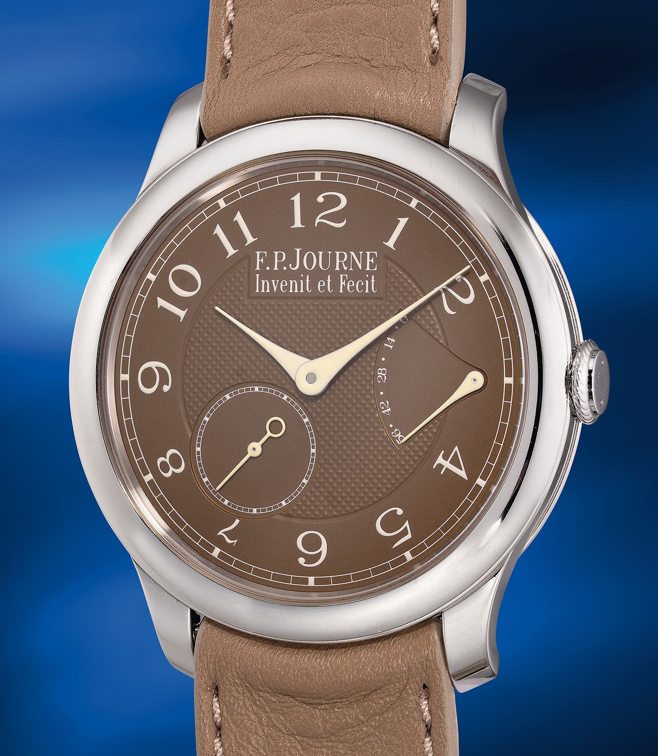 Merging comfort, innovation, and character, the current Chronomètre Souverain is presented in a warm tobacco brown known as “Havana”. This unique color, developed by Journe’s own dial maker, Les Cadraniers de Genève, is a blend of gold and ruthenium that underwent extensive refinement to achieve perfection. Housed in a discreet 40mm platinum case, the Chronomètre Souverain Havana features a Clous de Paris hobnail pattern on the dial, complemented by soft cream-colored hands and numerals, creating a harmonious aesthetic that captures the essence of Cuba.