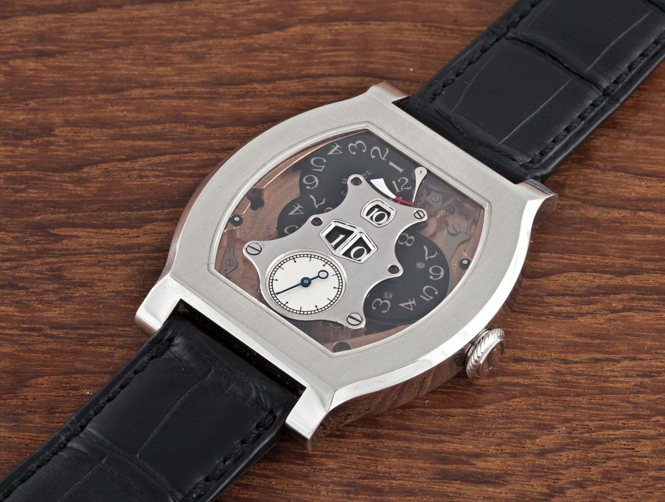 A very rare and unusual platinum limited edition skeletonized tonneau wristwatch with digital form display and power reserve