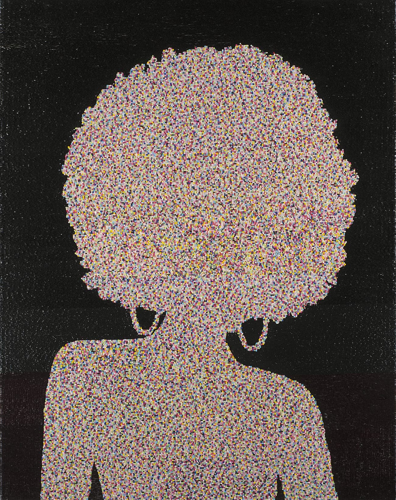 Executed in 2012, Natural resonates with Farhad Moshiri’s interest in Pop art, discerning an extraordinary, as well as hybrid, pictorial language that draws simultaneously from both popular Iranian and Western cultures. In the present lot, the artist applies his conventionally feminine technique of bead embroidery to create an ornamental quality to his work. Pairing pop culture with Iranian craftsmanship, Moshiri creates an ironic duality: “The Iranians are searching for their identity. depending on their mood, they lean towards the East or the West. Iran is undergoing an inevitable phenomenon that complicates, confounds and diversifies traditions. This is why I am just as inspired by the mall or the bazaar as I am by the ornamentation aesthetic that belongs to Iranian culture”, (F. Moshiri, quoted in ‘Fahrad Moshiri “Picnic”’, press release, Galerie Perrotin: Hong Kong, 26 February – 20 March 2013, p. 1).