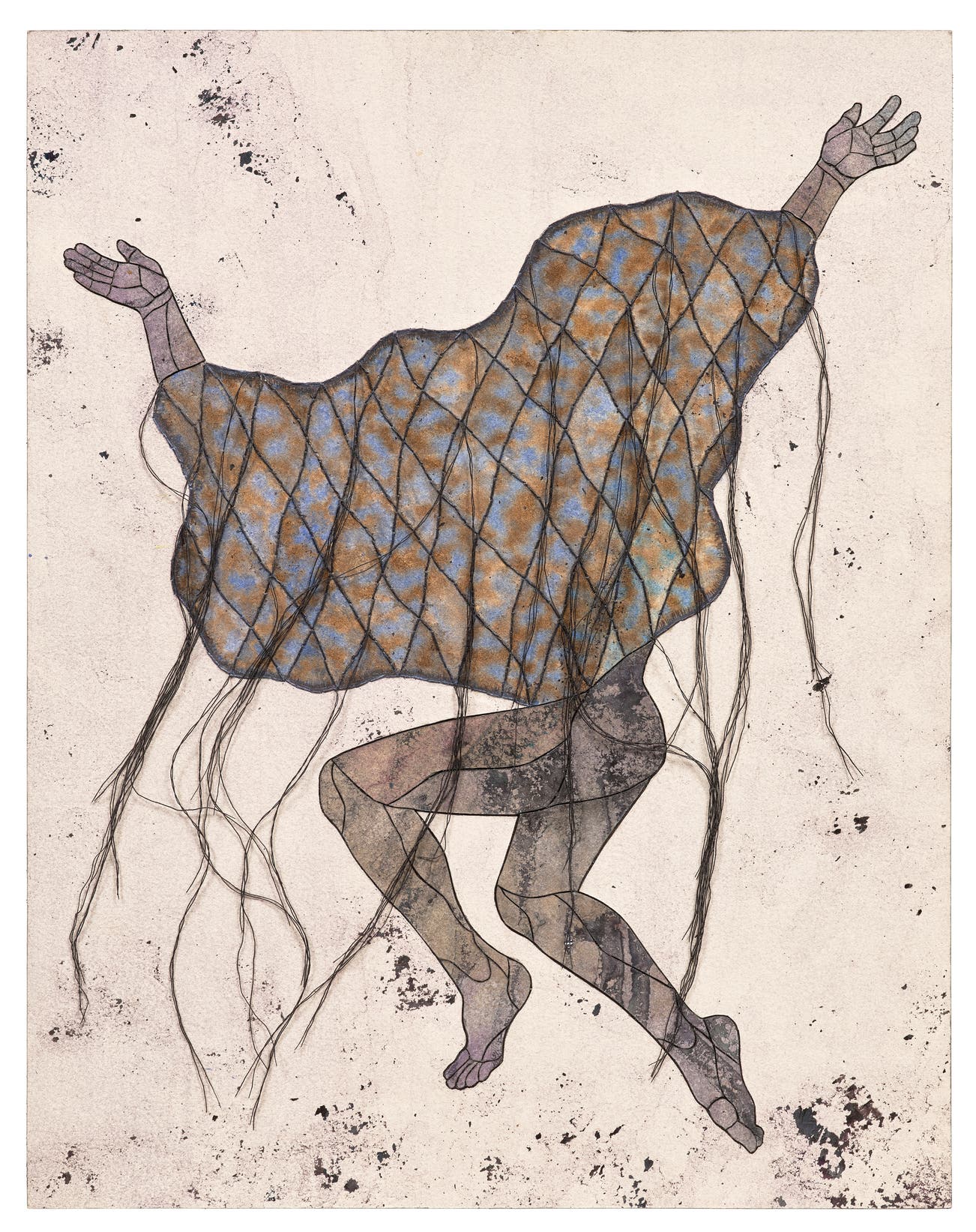 ink, graphite, Flashe, cut paper, acrylic, watercolor, varnish and embroidery on panel
