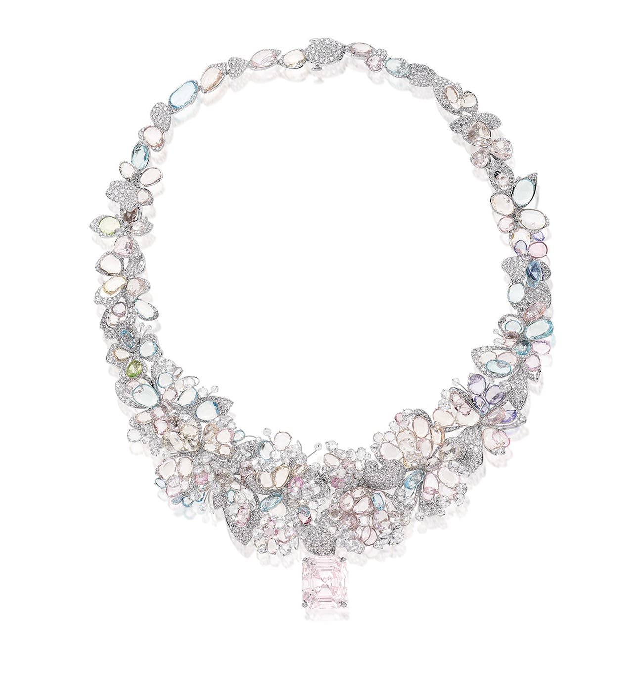 The effect is a dazzling, yet delicate, display of soft blues, purples, pinks and greens that combine to give an overall visual array of brightness, with the fabulous 19 carat Fancy Light Pink diamond suspended from the very heart of the garland in bloom.