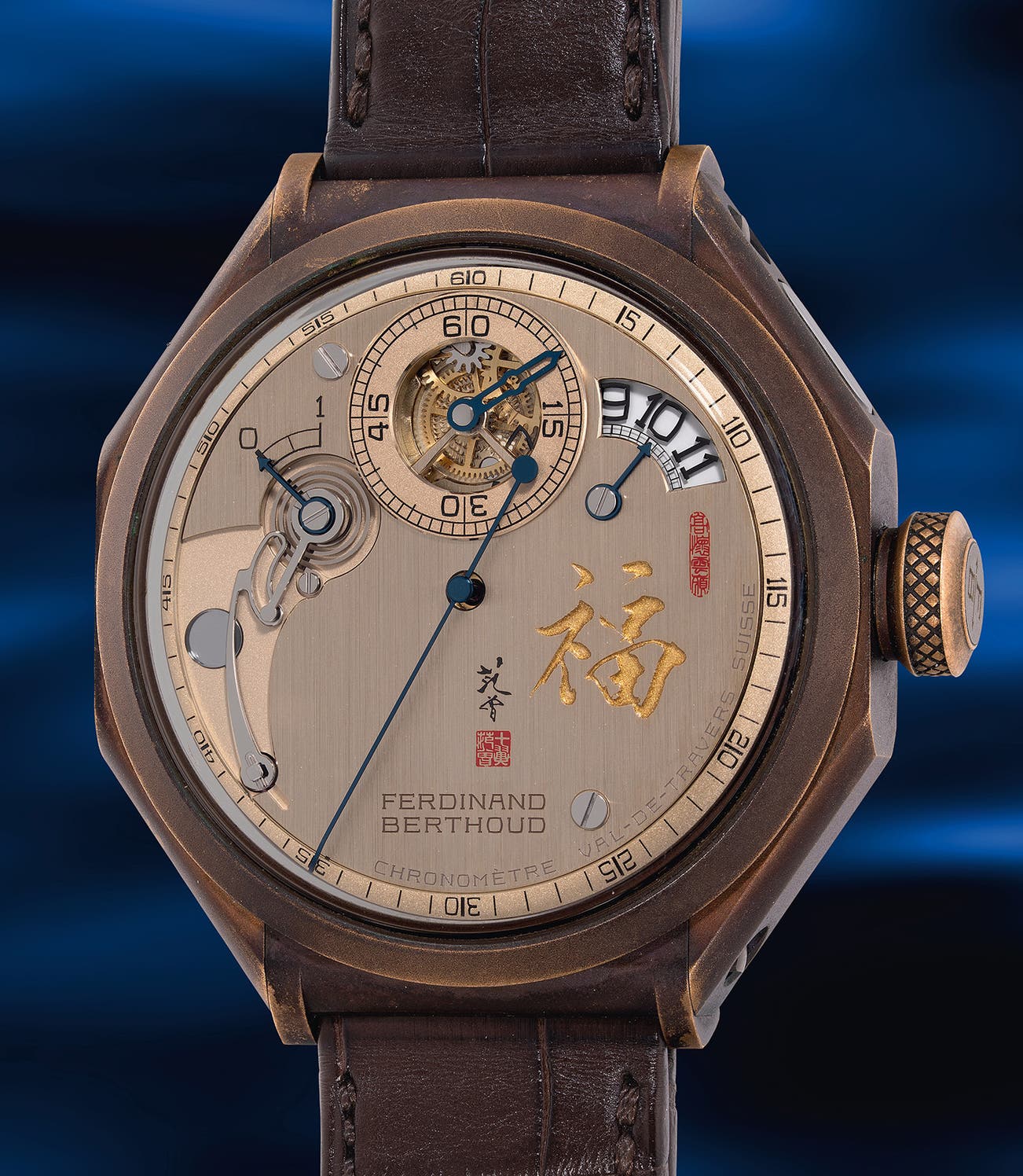 A unique, “like-new” and highly impressive bronze and titanium chronometer wristwatch with 1-minute tourbillon escapement, fusée-and-chain transmission, constant force regulation, power reserve indication, dial engraved with Fan Zeng’s calligraphy, certificate and presentation box