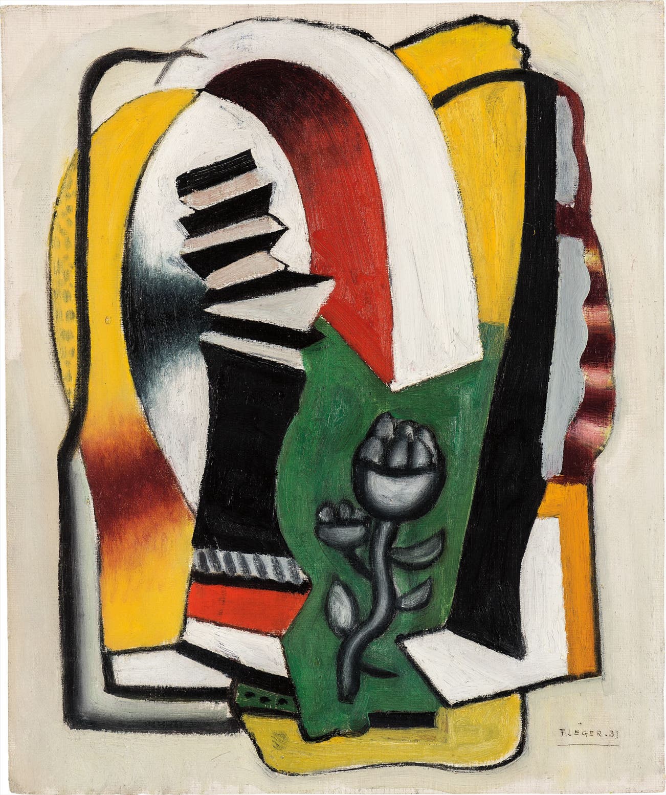 In 1931, when Léger painted Composition à la fleur, he had already visited the United States of America, where he later settled after escaping World War II. Léger’s creative output during the early 1930s can be considered his most enigmatic, with the artist’s transition of thought and evolution of style clearly evident. Throughout the 1930s Léger began to transform the austerity of the architectural structure of compositions into level, un-modeled surfaces akin to the Surrealist experimentations, juxtaposing irrational space. The present work displays the artist’s exceptional balance of colour, structure and naturally geometric forms, each element carefully studied and selected to build up the fabric of the composition.