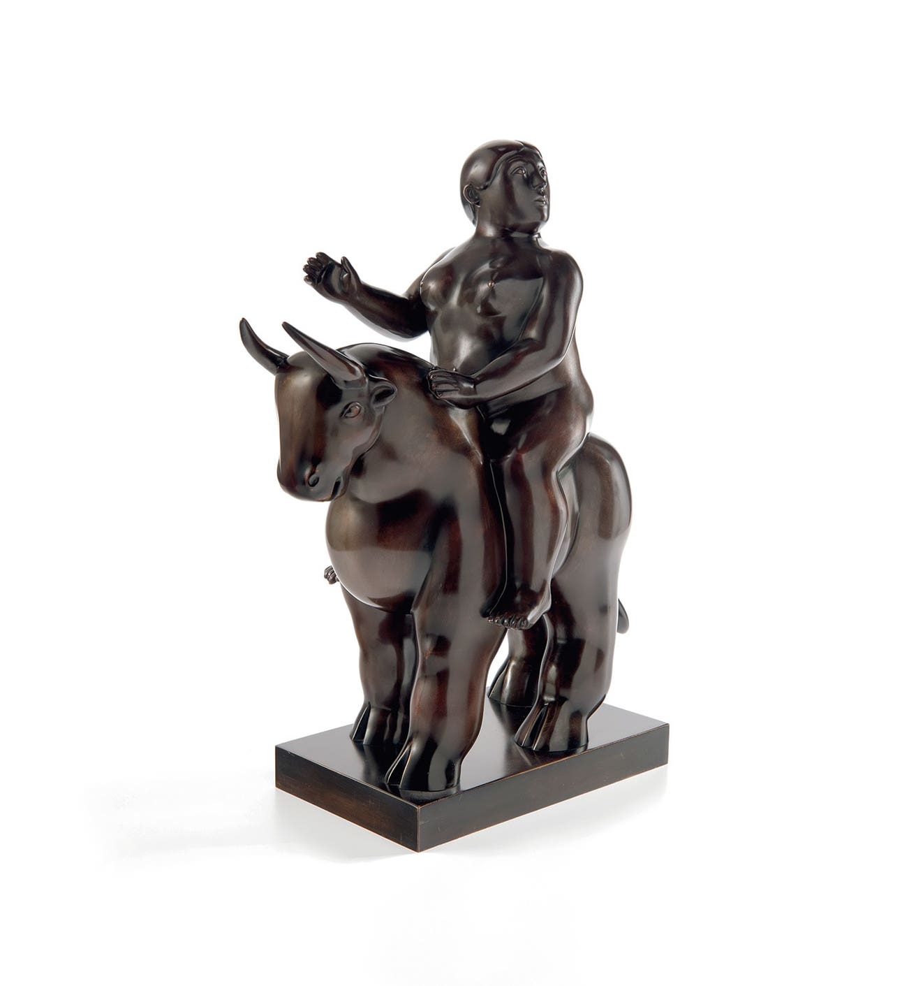 The rape of Europa was a favorite subject of Renaissance artists such as Titian, Veronese and Guido Reni, who depicted Europa, enrobed in hazy white gowns, atop the white bull. In Reni’s depiction, Europa gazes upwards passively at a mystical cherub floating in the sky, while Titian’s Europa claws at the air in clear distress while her handmaidens call to her from the shore. In contrast, Botero’s Europa sits astride the bull with confidence and poise, one hand resting on the bull’s powerful neck and head tilted back, perhaps to watch the coasts of her homeland recede beyond the horizon. She is nude, and the curves of her body mirror the shape of the bull’s muscular flanks. The art historian and artist John Sillevis writes, “As in all the techniques that Botero applies, he craves perfection, so the bronzes display a splendid surface in which all the riches of the modeling can be enjoyed by the play of light and shadow. The figures of mythology that we know from his paintings now come to us as larger than life divinities that can easily dominate a square or a rotunda in any city of the world. His reclining nudes, smoking or eating a forbidden fruit, with their undulating shapes, produce a most sensual and seductive effect" (John Sillevis, The Baroque World of Fernando Botero, New Haven, 2006, p. 31).
