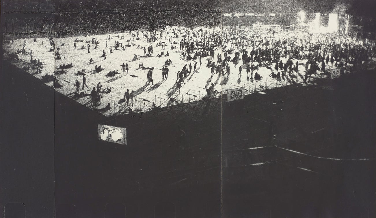 Searching for a contrast to his work in fashion and advertising, Fernell Franco produced many series documenting the underbelly of Colombian society. His subjects included urban marginality, destruction and transformation. Inspired by Italian Neorealism and film noir, Franco showcased his masterly use of chiaroscuro in his 1994 series Retratos de ciudad [City Portraits]. In lot 57, we see, from above, a mass of silhouetted figures populating a stadium with a stage in the far-right corner. Franco’s experimental approach to image-making is revealed in his language of grain, application of crayon and presentation of the work in three parts. For his first major project Prostitutas (1970-72), he photographed sex workers in brothels in the port city of Buenaventura. In lot 58, we see a young woman lying suggestively over a floral mattress, gazing directly at the camera. His interest in expressing a narrative in his photographs is evident in this arresting image.