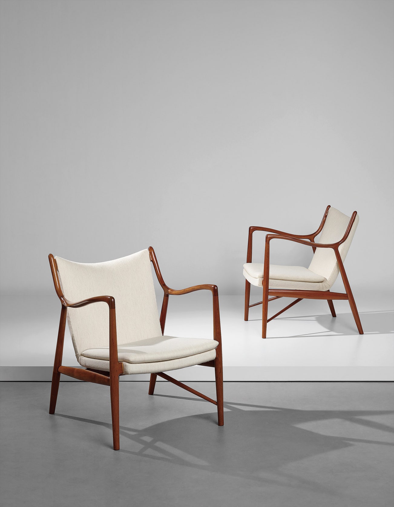 The present lot is a pair of armchairs, model no. “FJ 45”, produced in Bangkok Teak. Designed by the Danish architect Finn Juhl and executed by the master cabinetmaker Niels Vodder for the Cabinetmakers’ Guild, held at the Kunstindustrimuseet, Copenhagen where the design was first exhibited in 1945. From 1944 and continuing into the 1950s, Finn Juhl designed some of his finest cabinet made furniture for the Cabinetmakers’ Guild, and the “FJ 45” armchair must be considered one of his most accomplished and revered designs. During this period Juhl created the “FJ 44” dining chair that was then described by one critic as having “a sculptural form which apparently strains the wood to its upmost limits.” Then followed the “FJ 45” armchair that was celebrated for its frame “which is beautifully modelled or organic like a bone”, as stated by the Danish architect Erik Herløw in the periodical Arkitekten. The “FJ 45” demonstrates through the exquisite use of Bangkok Teak, importantly Juhl’s primary choice of timber, handcrafted, accentuated organic stiles and arms with elegantly carved wings.