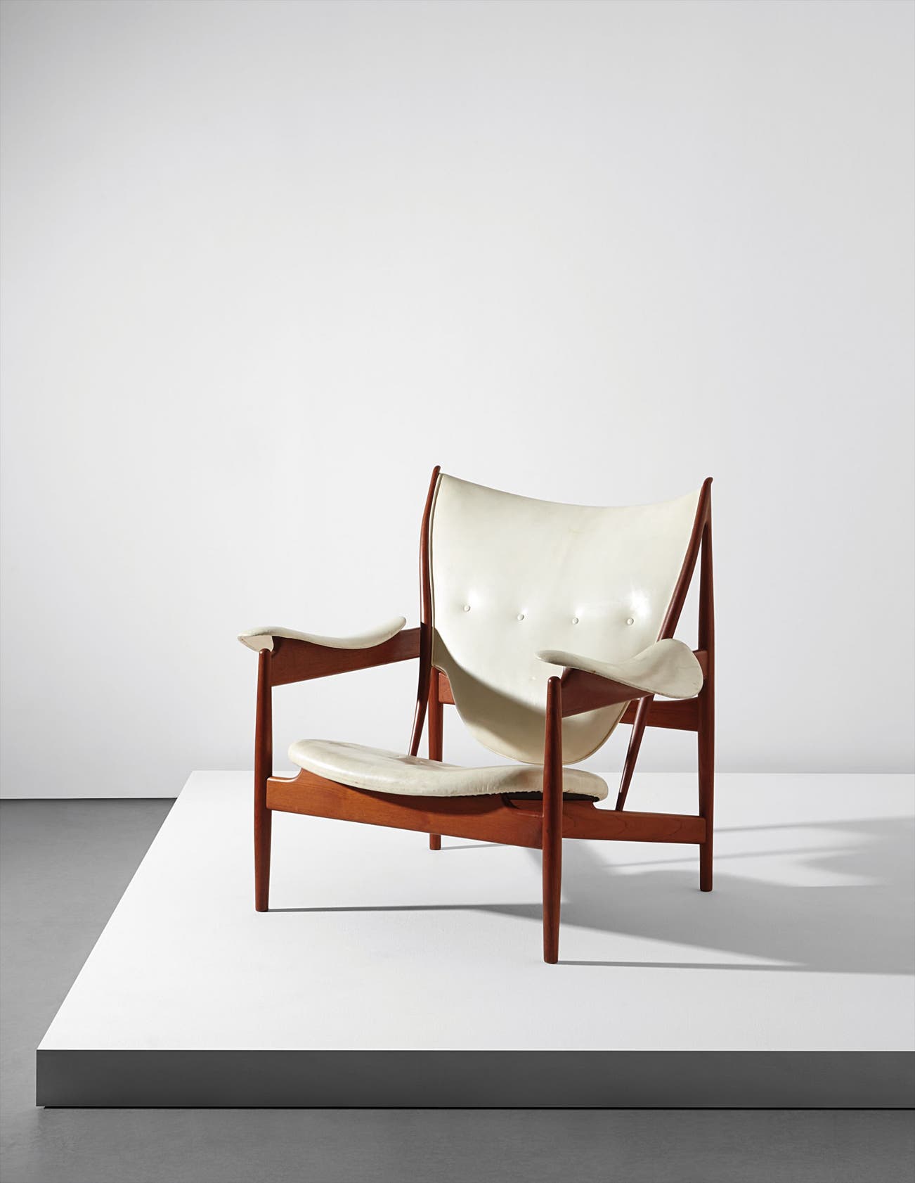 The “Chieftain” chair was designed for and first exhibited at the Copenhagen Cabinetmakers’ Guild, Kunstindustrimuseet, Copenhagen, in 1949. The period image illustrated here shows a four-buttoned upholstered chair, similar to the present lot, which appears to be an earlier design element. Three years later, in the 1952 exhibition “Interior 52” at the Nordenfjeldske Museum of Applied Art, Trondheim, Norway, Finn Juhl exhibited his “Chieftain” chair, but this time with three buttons, having altered the design slightly, and as it would remain for the duration of its production.