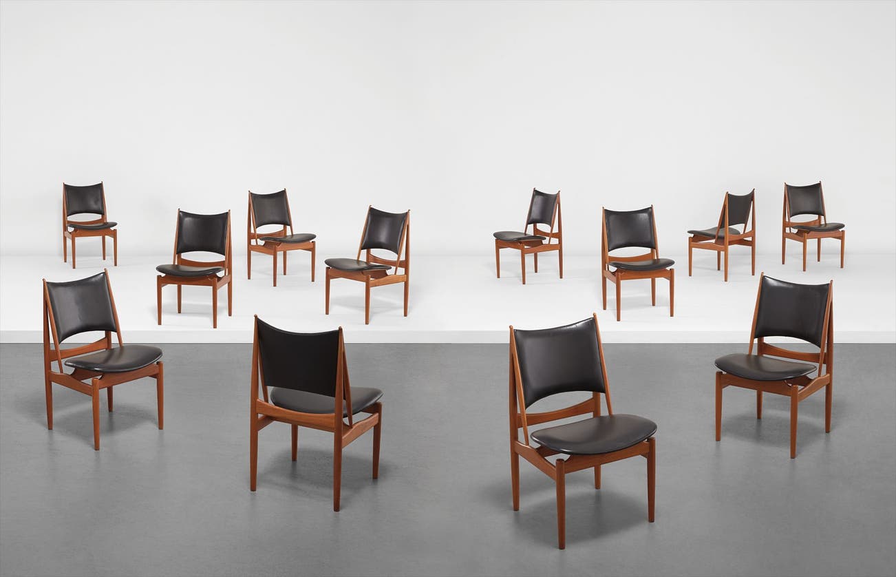 Executed by cabinetmaker Niels Vodder, Copenhagen, Denmark. Underside of ten chairs branded with CABINETMAKER NIELS VODDER/COPENHAGEN DENMARK/DESIGN: FINN JUHL.