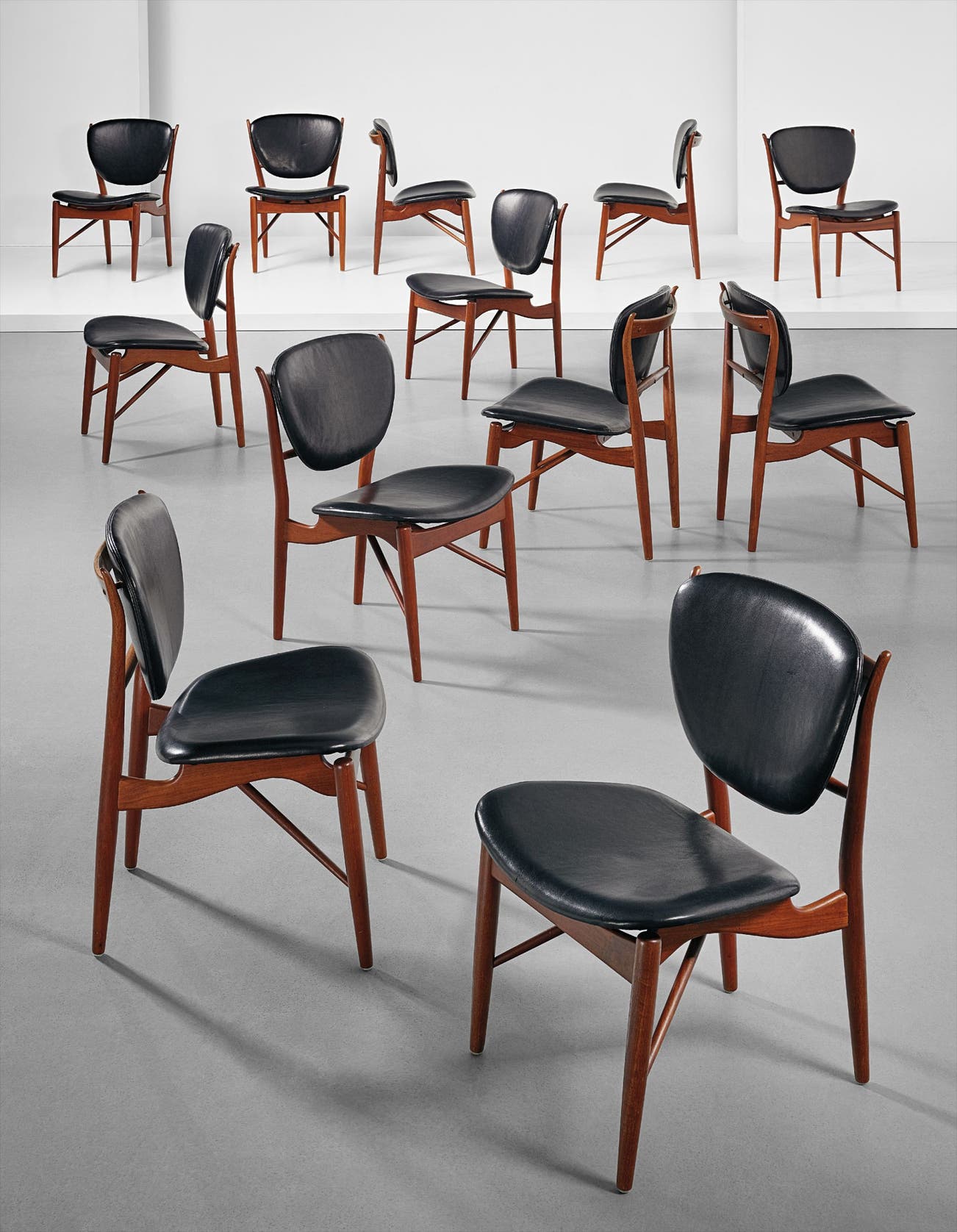 Executed by master cabinetmaker Niels Vodder, Copenhagen, Denmark. Underside of two chairs branded CABINETMAKER NIELS VODDER/COPENHAGEN DENMARK/DESIGN: FINN JUHL.