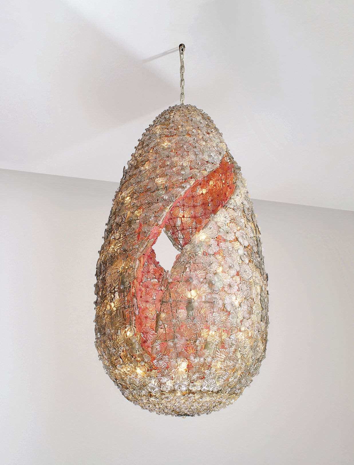 In the 1958 Venice Biennale, the Decorative Arts Pavilion was dedicated to Venetian glass, with an emphasis on lighting. For the pavilion, Seguso Vetri d’Arte exhibited the present ceiling light designed by the firm’s artistic director Flavio Poli. The work represented an extraordinary example of the expressive possibilities of the art of glassmaking, featuring innovative technical and formal lighting solutions. The technique used consisted of a reticular metal structure, on which polychrome blown glass flower-shaped elements were attached. Previously, this technique had only been applied to flat, backlit lighting designs, such as the large ceiling lights designed by Poli for the Hotel Bristol, Merano in 1954. For the first time, on the occasion of the XXIX Venice Biennale, Poli conceived this large three-dimensional, drop-shaped ceiling light, which revealed a diagonal opening that appears to cut through the light’s structure, emphasised by the use of contrasting coloured glass. The ceiling light was a great success with both critics and the public, and was one of the few examples of lighting illustrated in the exhibition catalogue with the title ‘Forma astratta’ (Abstract form). Following the exhibition, the ceiling light was exhibited at Seguso Vetri d’Arte, where it remained displayed in the entrance of the showroom until its closure.