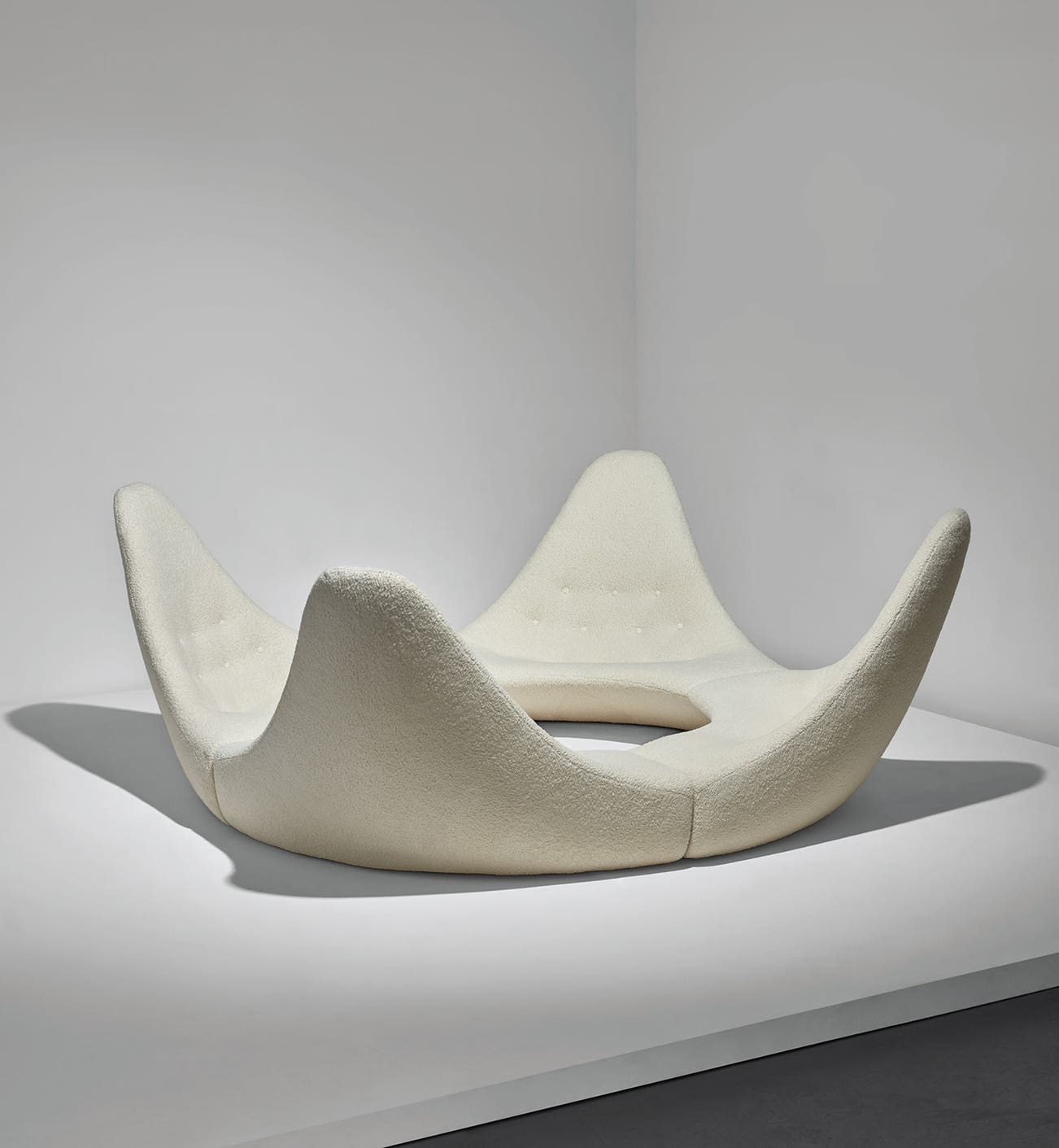 The present sofa design was the winning entry of the United Foam furniture design competition at the School of Applied Art in Copenhagen in 1967. The present model Kronen (Danish for crown) sofa consists of four modular elements of foam-covered fiberglass on one circular steel ring base. It was chosen by N.A. Jørgenson in Bramming to go into production, but ultimately only a few were made and the design never went into full-scale manufacturing. The competition and the winning design were reported about in two major Scandinavian publications at the time – Form and Mobilia. Shown in the magazines originally covered in Verner Panton “Unisol” fabric, remnants of which were found on the present lot, it is possible this example was the sofa featured in the competition, and thus illustrated in the publications.