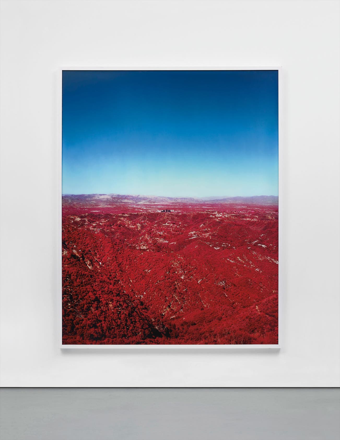 The work in the current lot is part of a series in which the artist employs infrared film then digitally manipulates the image before printing it as a c-type print. With the film’s ability to invert the colour green into red while keeping all other colours intact, Saddle Peak’s green flora turns into an apocalyptic red. This particular film also has an affinity to early colour photography, while the final image incorporates an effect of science fiction. The resulting image oscillates between an industrial wasteland and a red hot Californian desert, imposing a bizarre tension on the viewer. Containing composites, non-photographic details and unconventional tones, the work subverts the old saying ‘Life is stranger than fiction’. In this case, fiction is certainly stranger and more fantastic than life.