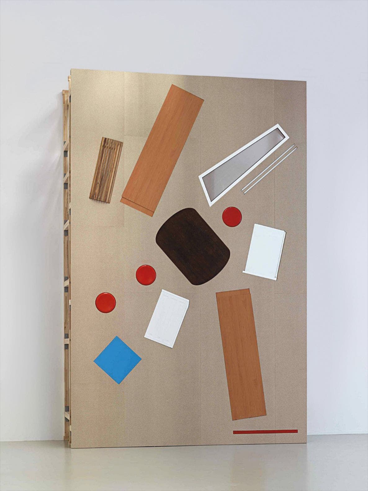 washing machine, fridge, three red wooden and metal stools, blue Ikea Lack table, brown wood kitchen table, metal and wood bench, two flat pack Ikea Pax wardrobes without doors, red Ikea Lack shelf, side panel from a porch roof, two fluorescent strip lights
