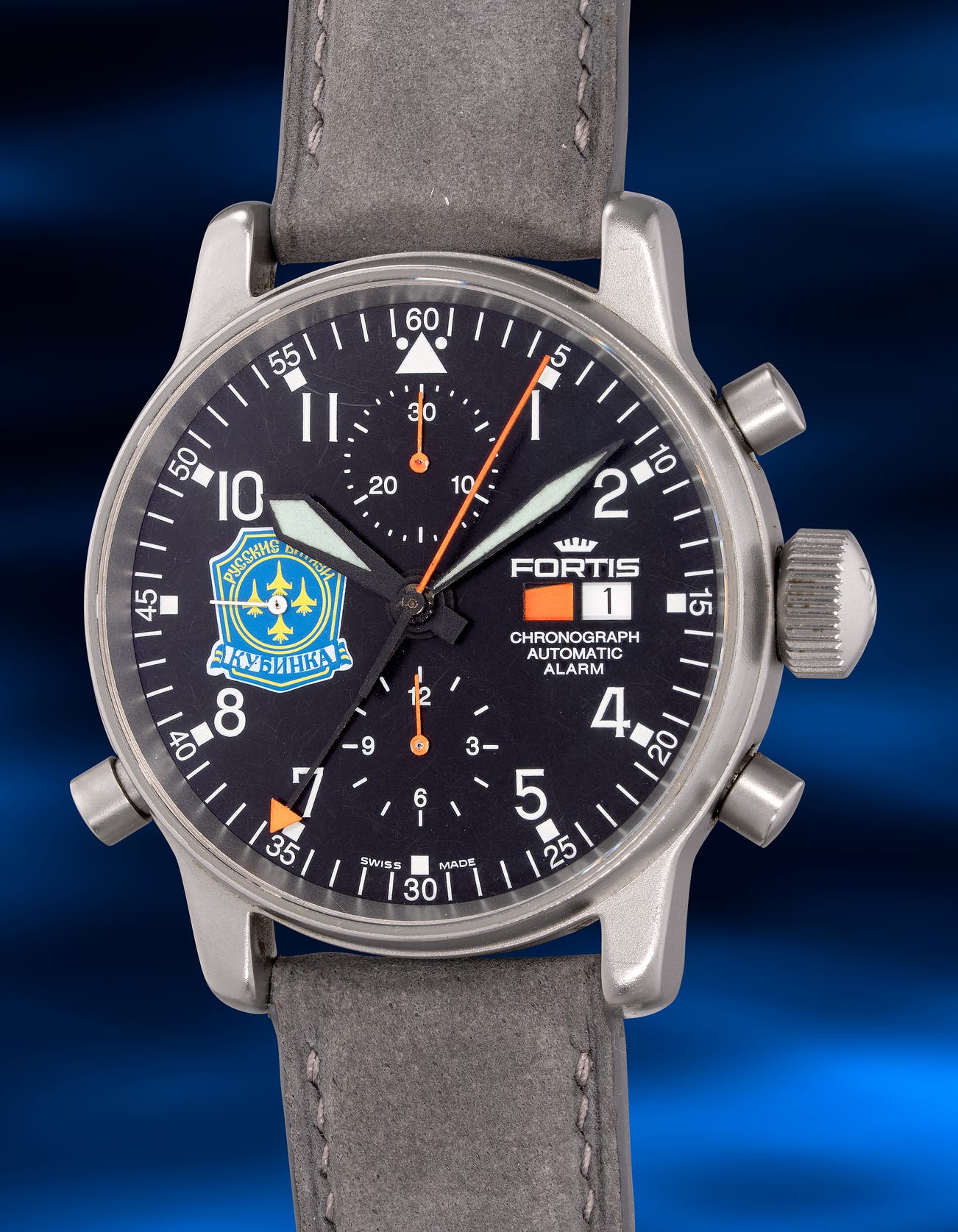 - Manufactured during Fortis' peak, when it was the official supplier of chronographs to the Russian space program, the dial features the emblem of the Russian Knights (Русские Витязи), the aerobatic demonstration team of the Russian Air Force.