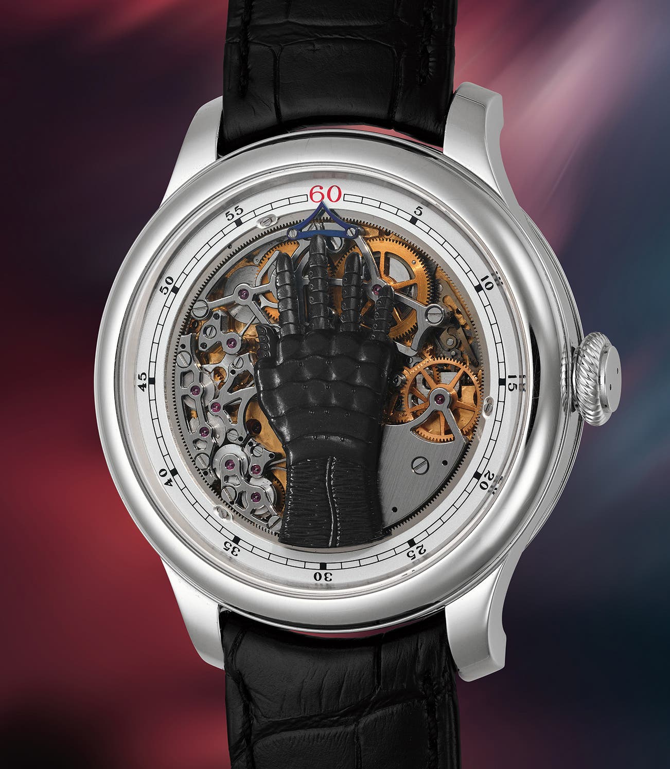 François-Paul wished to move away from “naturalism” in the appearance of the hand, and thus decided on Paré’s hand as the archetype for the automaton that would indicate the hours on this new watch. It has an almost steampunk vibe, with overlapping metallic plates with individual screws, reminiscent of medieval armor such as the gauntlet, made to protect the hands and wrists in battle.