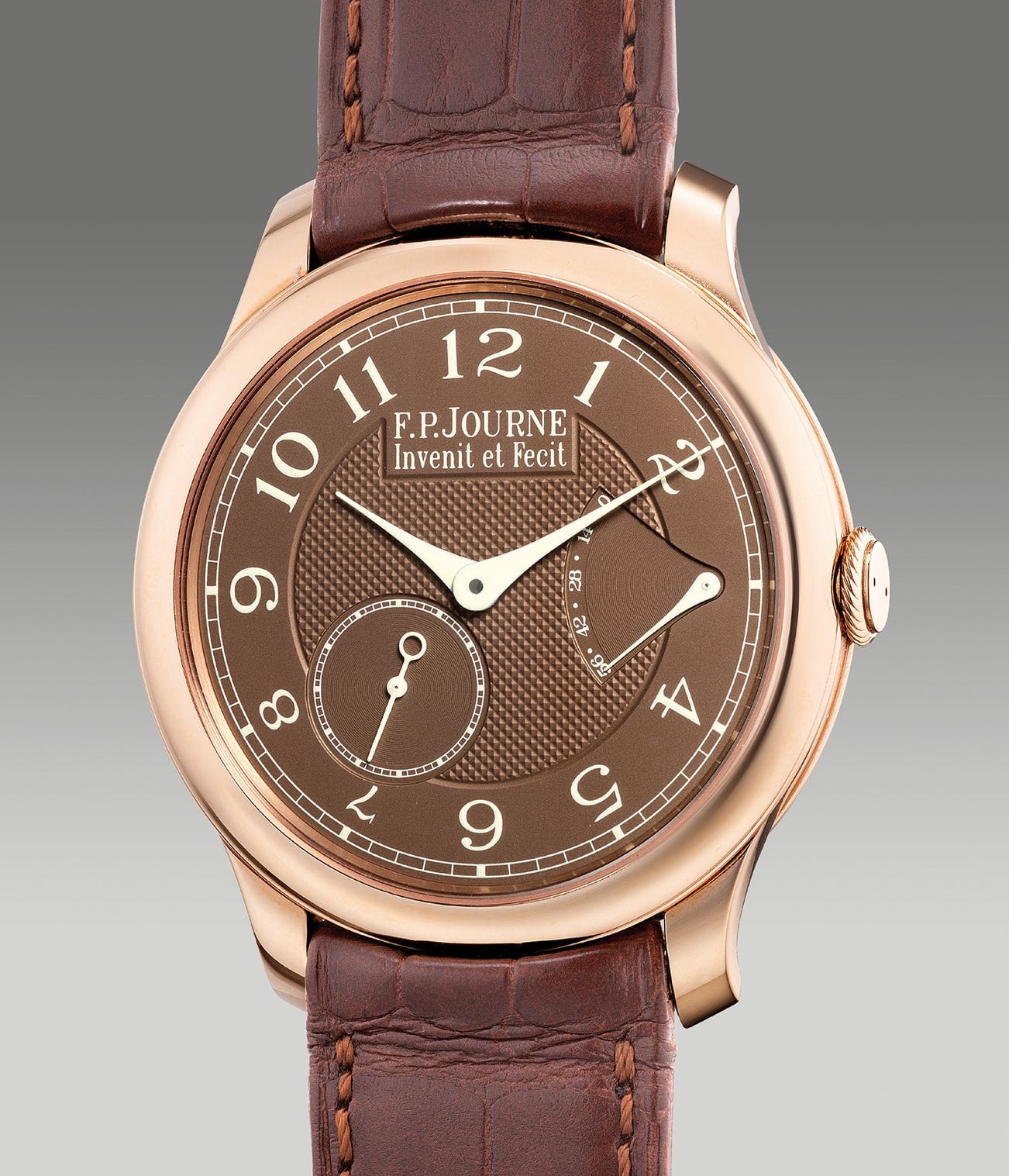 The present example in pink gold is fitted with an attractive “chocolate” brown dial which matches perfectly with the material of the case. Presented in excellent overall condition and accompanied by the full set of accessories, the present timepiece will most certainly attract the ever growing enthusiast and collectors of F.P. Journe.