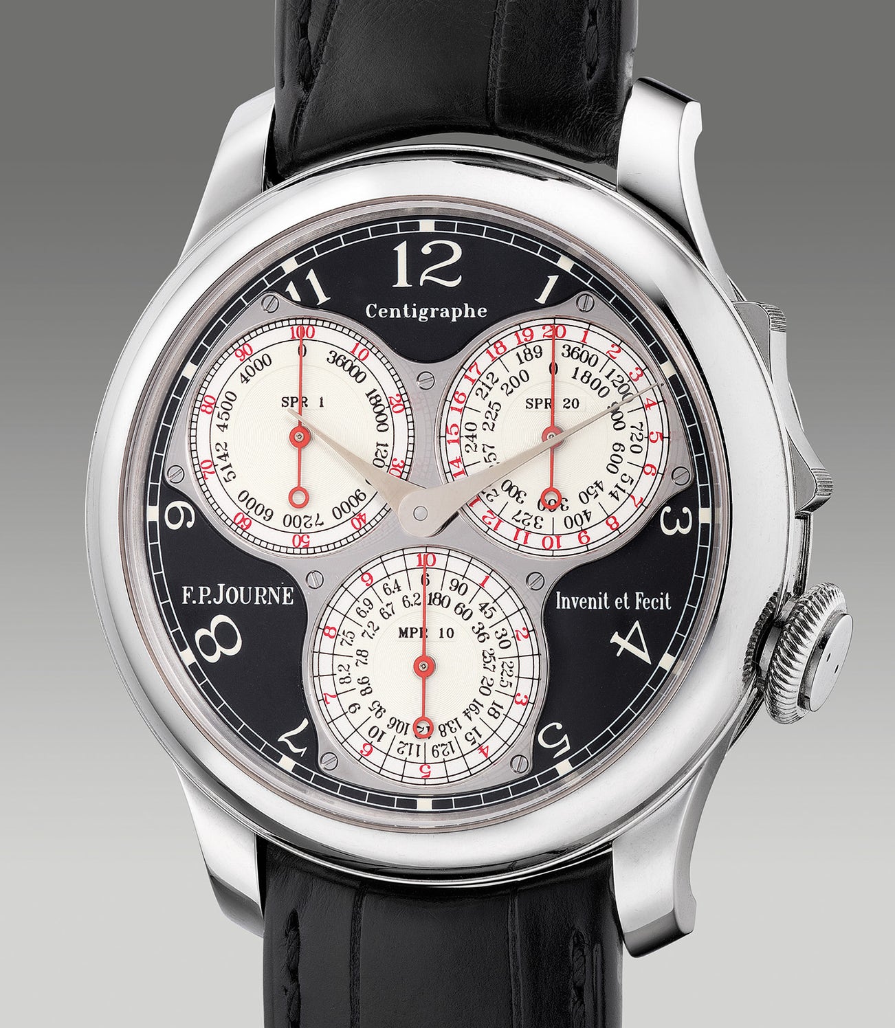 A fine and impressive platinum chronograph wristwatch with 100th of a second, 20 seconds, 10 minute register, black lacquer dial, guarantee and box, made exclusively for the F.P. Journe boutiques worldwide