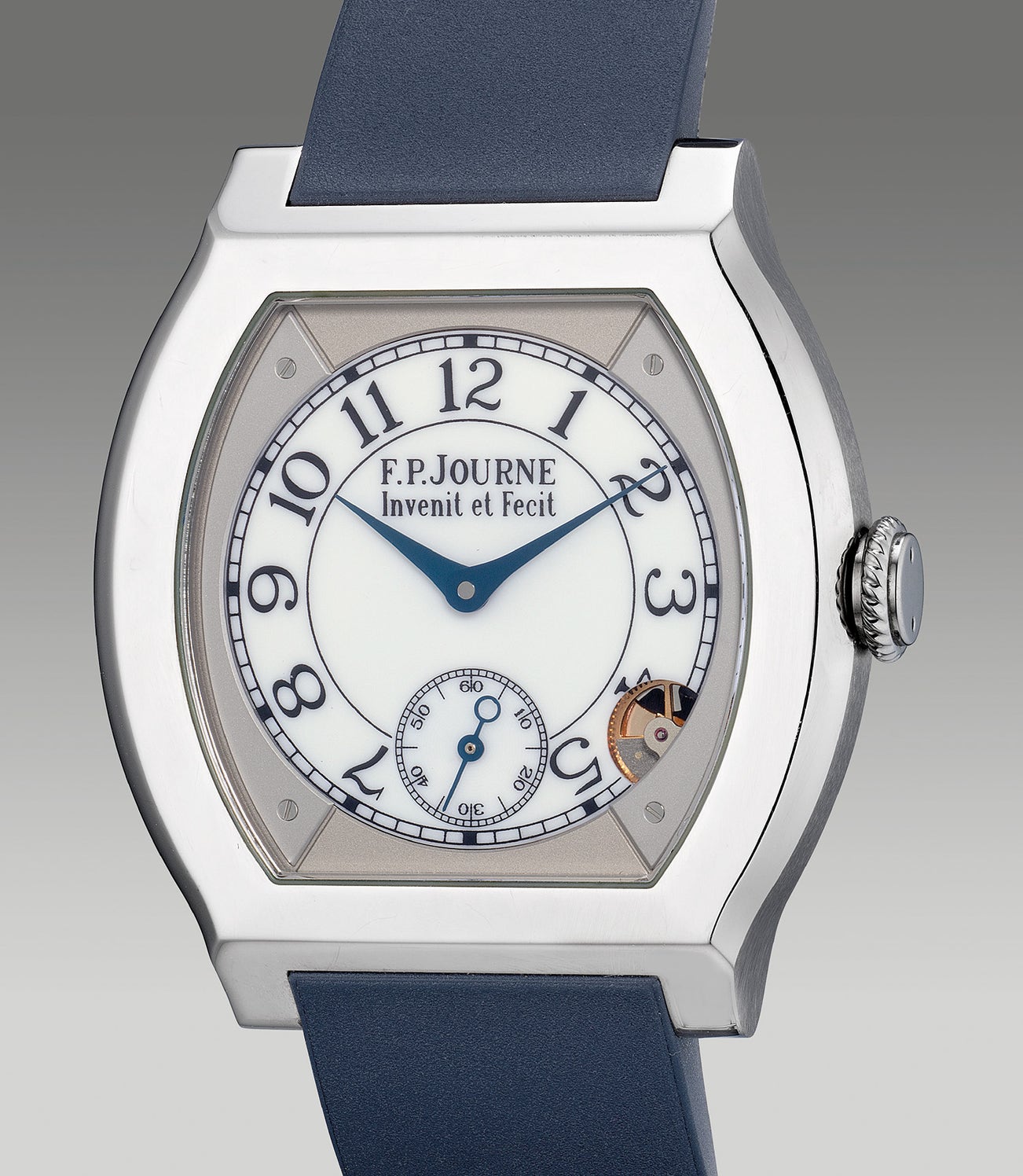 A revolutionary horological concept, the Élégante design was first conceived exclusively for the ladies with the vision of true luxury and ingenuity. As Francois Paul-Journe says: "I created this watch because for 20 years, women have been asking me to design a watch for them; a watch that was different and comfortable to wear, and that suited their needs and desires. I therefore created this long-lasting watch especially for them." Brilliant in its aesthetics and mechanism, the Élégante has garnered the attention of many with soaring demand and long waiting list in recent times. Equipped with a proprietary electro-mechanical movement that features a motion detector visible on the dial at 4:30 aperture, the watch is able to conserve its energy by stopping the hands and rotors while keeping time in the back of its mind. Once the watch is moved again, it awakens and miraculously readjusts to the current time by taking the shortest path—either clockwise or counter clockwise, a true delight to witness the magic. Furthermore, the luminous dial provides intense luminosity in the dark allowing the wearer to view the entire dial at night. The present Élégante sized at 40mm titanium case is paired with a midnight blue rubber strap that perfectly embraces the wrist with sophistication. Offered in an excellent overall condition and accompanied with its accessories, the Élégante is certainly one of the most sought after independent timepiece born for the discerned ladies with a passion for horology.
