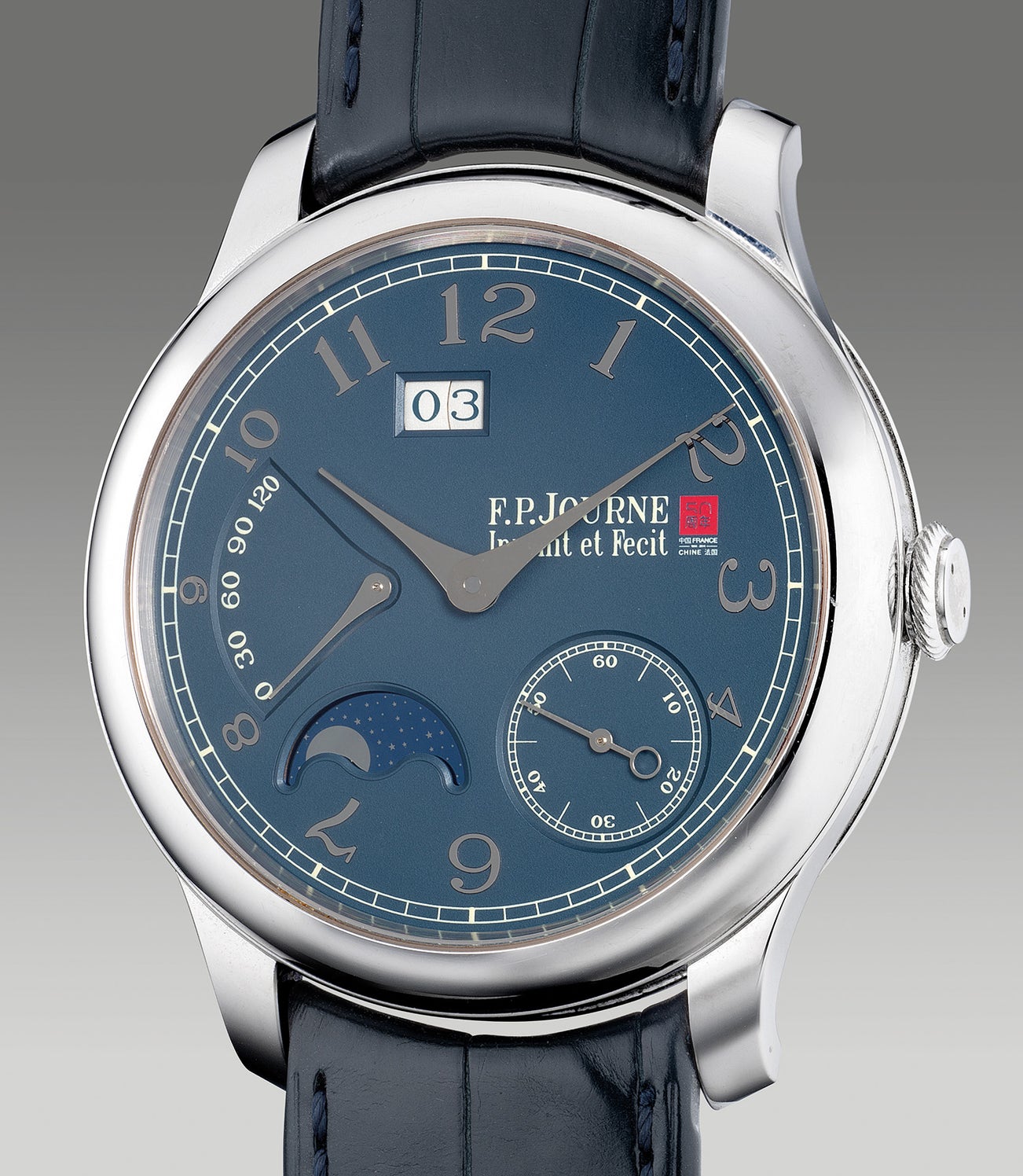 A rare and attractive limited edition platinum wristwatch with small seconds, date, power reserve, moon phases, certificate and presentation box, made to commemorate the 50th anniversary of diplomatic relations between France and China