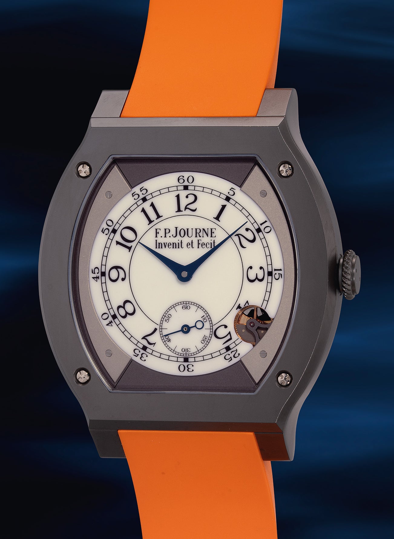 The present Élégante example with 48mm Titalyt case is complemented by a charismatic orange rubber strap, which elevates the watch with a sporty yet elegant and sophisticated look. Offered by the original owner and preserved in “like-new” condition, it is accompanied by its complete set of guarantee and presentation box.