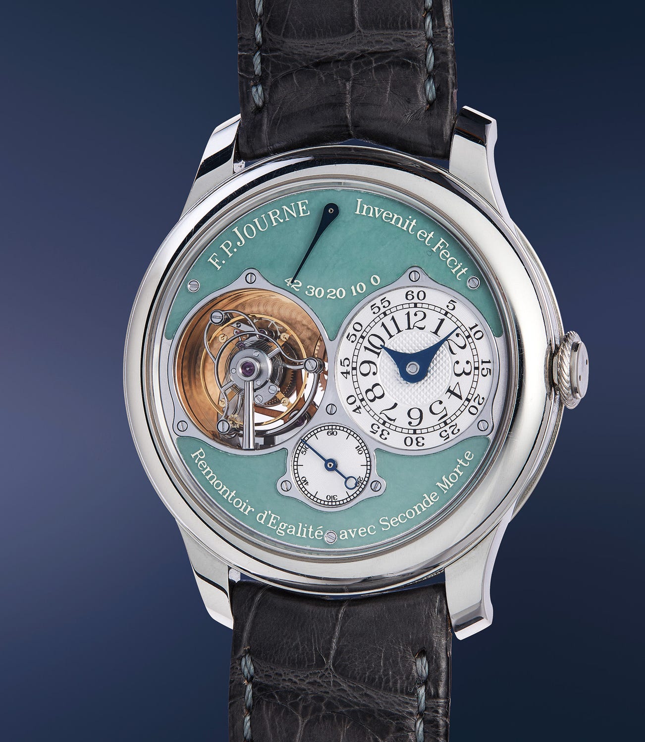 Accompanied by F.P. Journe Certificate of Guarantee confirming purchase of the watch on February 24th 2015 with a special request green jade dial, two original invoices, product literature, polishing cloth, additional unworn tan crocodile strap, fitted presentation box, and outer packaging.