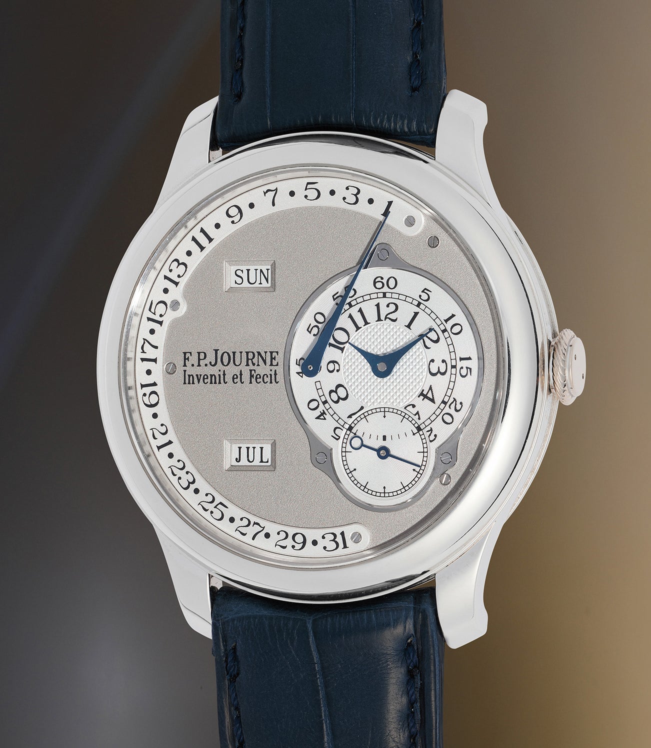 The present F.P. Journe Octa Calendrier in platinum from approximately 2008 with an attractive grey dial is offered for the first time at auction with its complete set of accessories. With a substantial surge in demand for F.P. Journe timepieces today, this is a great opportunity for collectors to acquire a discontinued example of one of the most iconic models manufactured by the firm.