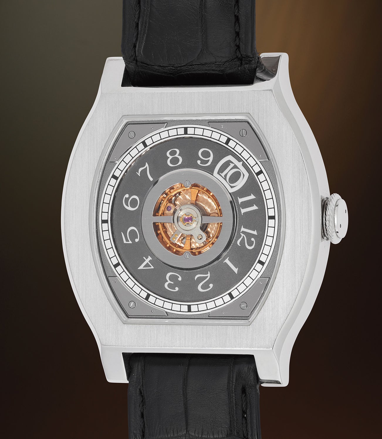 A very rare and fine limited edition platinum tonneau-shaped wristwatch with wandering hours; number 44 of a limited edition of 69 pieces